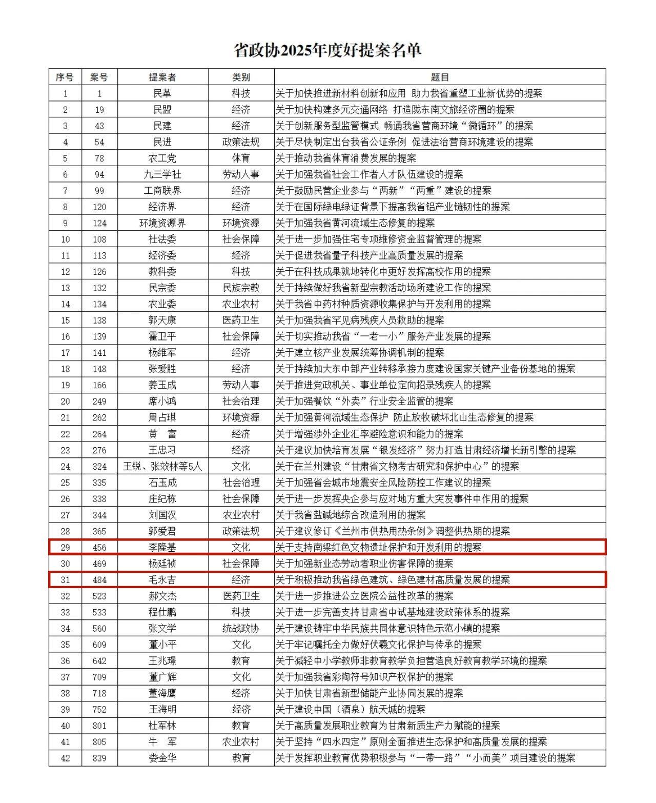 為進一步提高提案工作的質量和實效,根據(jù)《中國人民政治協(xié)商會議甘肅省委員會提案工作條例》和《政協(xié)甘肅省委員會年度好提案通報表揚實施辦法(試行)》,經(jīng)政協(xié)甘肅省第十三屆委員會第四十一次主席會議審議通過,現(xiàn)對《關于加快推進新材料創(chuàng)新和應用 助力我省重塑工業(yè)新優(yōu)勢的提案》等42件省政協(xié)2025年度好提案予以通報表揚。