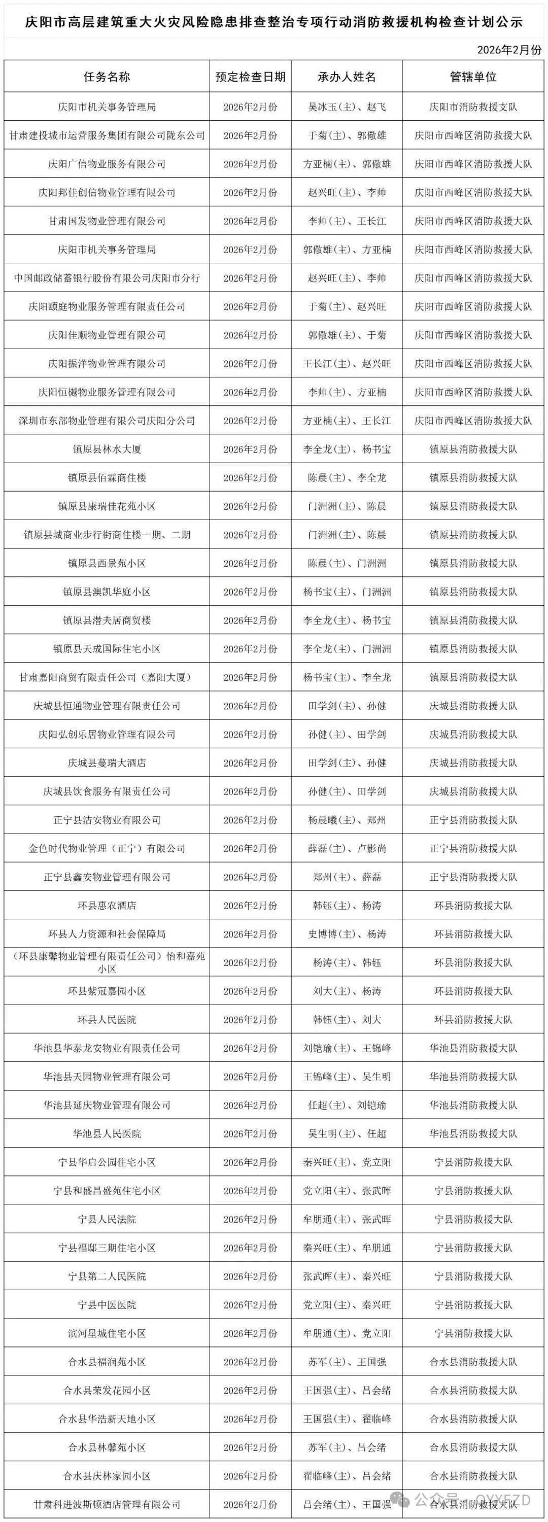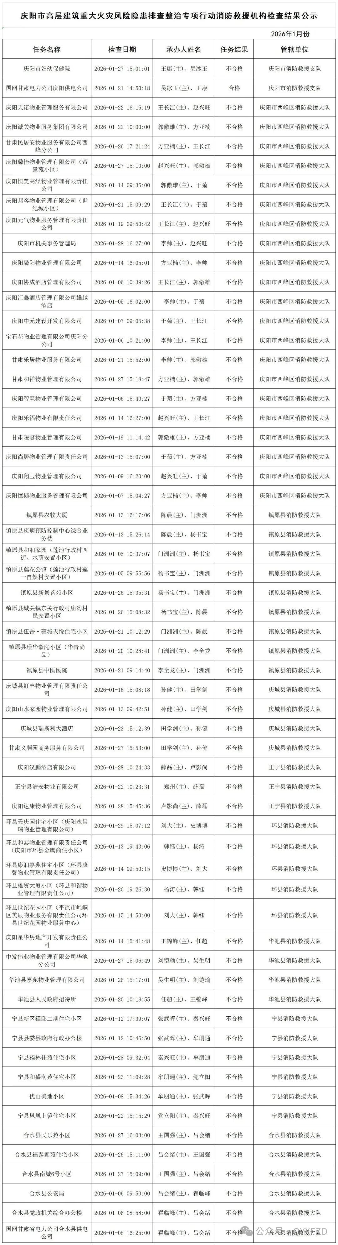 為貫徹落實國務(wù)院安委會和省、市安委會關(guān)于開展高層建筑重大火災(zāi)風險隱患排查整治專項行動的部署,現(xiàn)將慶陽市高層建筑重大火災(zāi)風險隱患排查整治專項行動消防救援機構(gòu)1月份檢查結(jié)果和2月份檢查計劃公示如下: