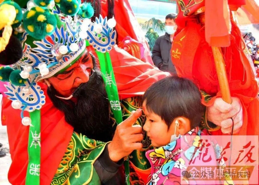 再過幾年,改革開放了,我們城關(guān)公社改成了老城鎮(zhèn),廟莊大隊(duì)也變成了廟莊村。那年冬天,鎮(zhèn)上給我們廟莊村撥了一筆經(jīng)費(fèi),讓村里排演社火。這時(shí)候村里那些表叔、表叔媽們又有了用武之地。他們紛紛粉墨登場,又演起來了。因?yàn)榻?jīng)費(fèi)有限,道具之類能簡則簡,不少還需自制。龍燈的龍頭是用葦稈扎結(jié)然后用紙裝飾的,龍身是很長的白綢制作,鱗片是劉老師一筆一筆畫出來的;獅子是用麻纖維編起來的,倒也威武;燈籠也是葦稈扎好糊上紙,里邊點(diǎn)的蠟燭也是用蒿子稈做燭芯、用羊油做的燭身,純手工制作的。戲裝只有簡單的頭飾,一圈絨球往頭上一裹,連包頭布都沒有,光頭都露出來毫不遮掩。面部掛上髯口,披一條紅被面當(dāng)做披風(fēng),稍微講究一點(diǎn)后面還背著四桿護(hù)背旗,這就是一個(gè)武將的全部行頭了?;瘖y也就是將就著給臉上胡亂抹點(diǎn)或紅或黑的顏料就夠了。至于里邊還露出原本穿著的黑棉襖、棉褲、腳上穿著棉窩窩鞋,直接就現(xiàn)了原形了,就像神話小說里那些修為不高不能完全化形的神魔。兵器,都是用幾根竹枝并起來用布條纏綁起來作為刀槍的桿,刀槍的主體部分用木板修出形狀,粘貼上煙盒里拆出的錫紙,弄得閃閃發(fā)光,寒氣逼人。