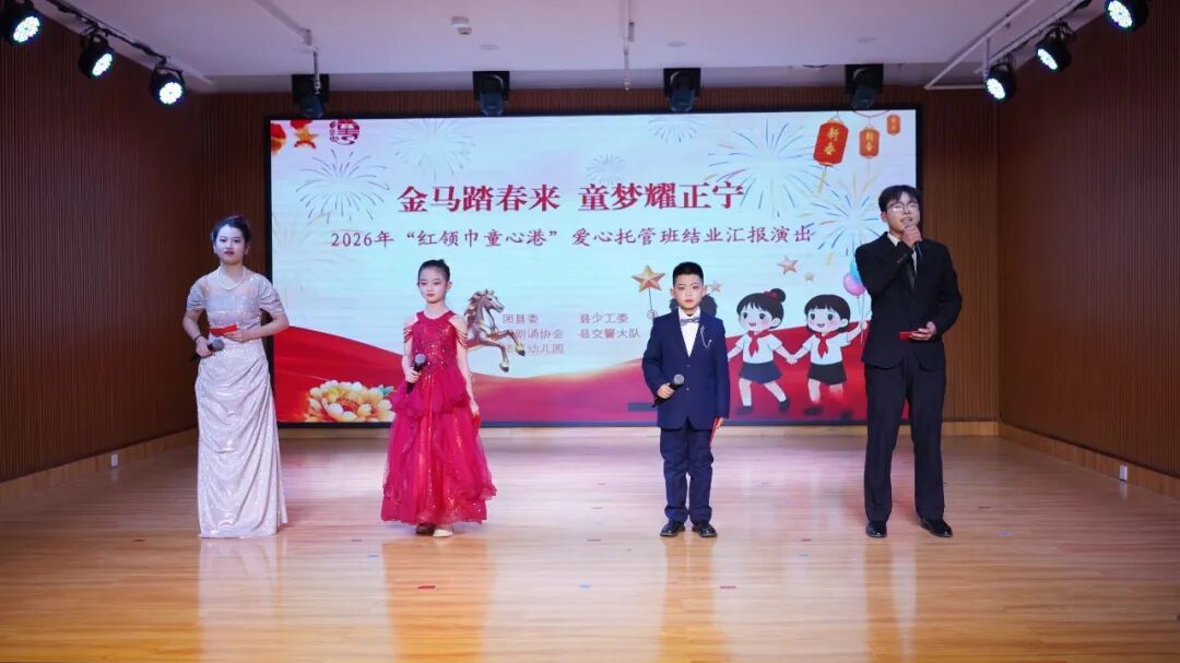 2月4日,“金馬踏春來(lái) 逐夢(mèng)耀正寧”2026“紅領(lǐng)巾童心港”愛(ài)心托管班結(jié)業(yè)匯報(bào)演出在縣城博苑幼兒園精彩上演。本次活動(dòng)由團(tuán)縣委、縣少工委主辦,縣朗誦協(xié)會(huì)、縣交警大隊(duì)、博苑幼兒園協(xié)辦。