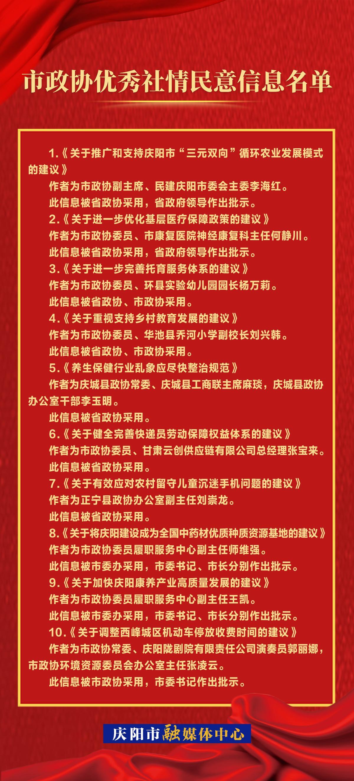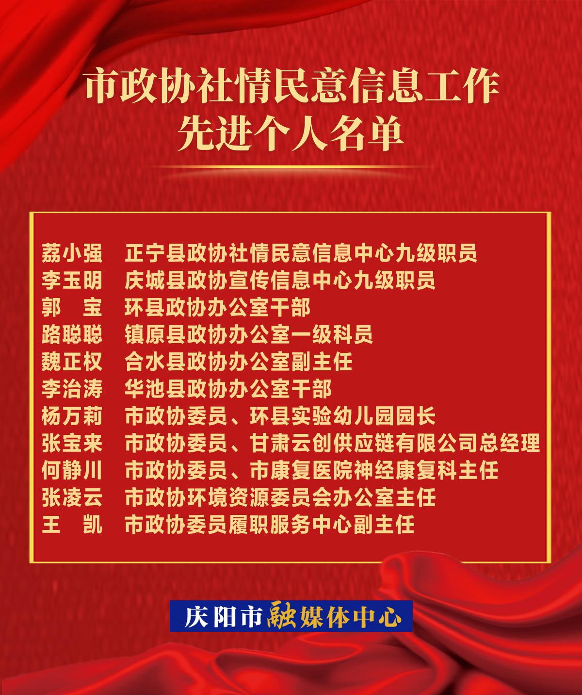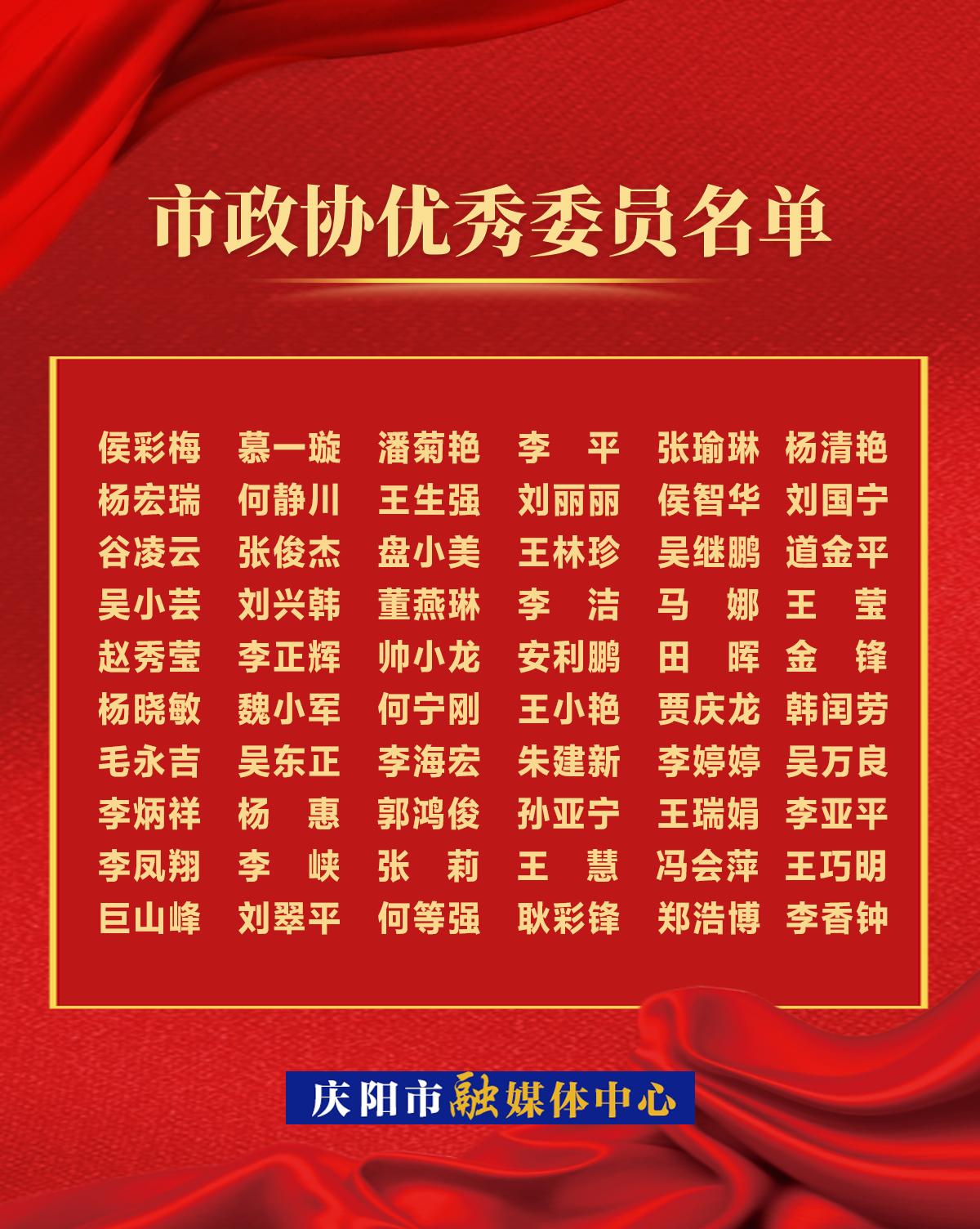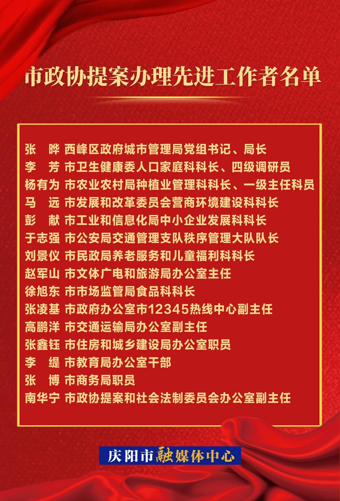 為表揚先進(jìn)、樹立典型,激勵全市政協(xié)系統(tǒng)和廣大政協(xié)委員在新征程上再創(chuàng)佳績、再立新功,經(jīng)市政協(xié)五屆五十一次主席會議研究決定,對侯彩梅等60名市政協(xié)委員;市政府辦公室等14個提案承辦先進(jìn)單位,張曄等15名提案辦理先進(jìn)工作者,《關(guān)于加強(qiáng)馬蓮河流域河床淤泥清理及生態(tài)治理的提案》等18件優(yōu)秀提案;正寧縣政協(xié)等4個社情民意信息工作先進(jìn)單位,荔小強(qiáng)等11名社情民意信息工作先進(jìn)個人,《關(guān)于推廣和支持慶陽市“三元雙向”循環(huán)農(nóng)業(yè)發(fā)展模式的建議》等10篇優(yōu)秀社情民意信息,予以通報表揚。