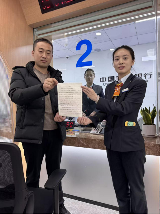 業(yè)務(wù)辦結(jié)后,王先生深受感動,特意手寫一封表揚(yáng)信送至網(wǎng)點(diǎn)。信中真摯寫道:“本以為大量零鈔的存款需求會被拒絕,沒想到建行員工毫無怨言,還犧牲休息時間全力幫忙清點(diǎn),這份耐心與專業(yè)讓我倍感溫暖,這才是真正為老百姓辦實(shí)事、解難題的貼心銀行!”