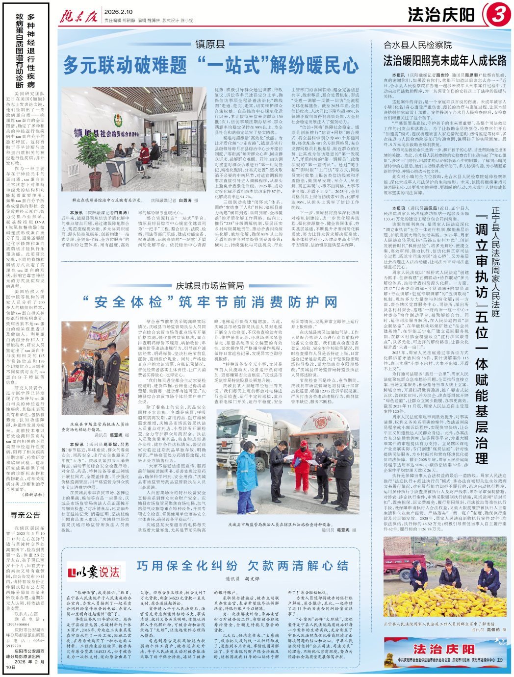 三級(jí)聯(lián)動(dòng)構(gòu)建“閉環(huán)式”體系。圍繞“案結(jié)事了人和”目標(biāo),鎮(zhèn)原縣著力構(gòu)建“橫向到邊、縱向到底、全域覆蓋”的矛盾化解工作網(wǎng)絡(luò)??v向上,推行“235”分級(jí)調(diào)解機(jī)制,層層壓實(shí)鄉(xiāng)村兩級(jí)屬地責(zé)任,推動(dòng)矛盾糾紛源頭化解、就地化解,確保85%以上的矛盾糾紛在鄉(xiāng)村兩級(jí)得到妥善處置;橫向上,持續(xù)強(qiáng)化與司法機(jī)關(guān)、行業(yè)主管部門(mén)的協(xié)同聯(lián)動(dòng),健全完善信息共享、線索移送、聯(lián)合處置機(jī)制,形成“受理—調(diào)解—反饋—回訪”全流程閉環(huán)化解鏈條。截至2025年底,全縣信訪批次、人次同比下降均超40%,各領(lǐng)域矛盾糾紛得到高效處置,為全縣社會(huì)穩(wěn)定發(fā)展注入了強(qiáng)勁動(dòng)力。