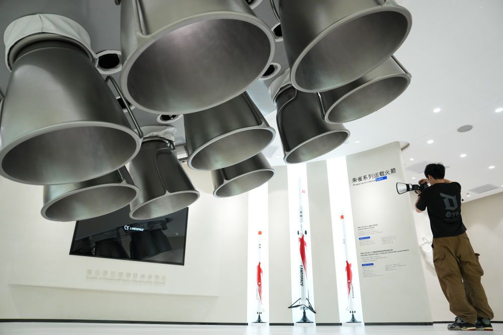 強化產(chǎn)業(yè)圈聯(lián)動發(fā)展,是北京持續(xù)提升科技成果區(qū)域內(nèi)轉(zhuǎn)化效率和比重的有效舉措。以商業(yè)航天產(chǎn)業(yè)為例,目前,扎根北京的商業(yè)航天百強企業(yè)、上市企業(yè)和獨角獸企業(yè)約占全國半壁江山。產(chǎn)業(yè)鏈覆蓋運載火箭、衛(wèi)星制造、地面站及終端設(shè)備、衛(wèi)星應(yīng)用服務(wù)全領(lǐng)域。這是2025年6月18日在北京經(jīng)濟技術(shù)開發(fā)區(qū)藍箭航天空間科技股份有限公司拍攝的朱雀系列運載火箭模型。