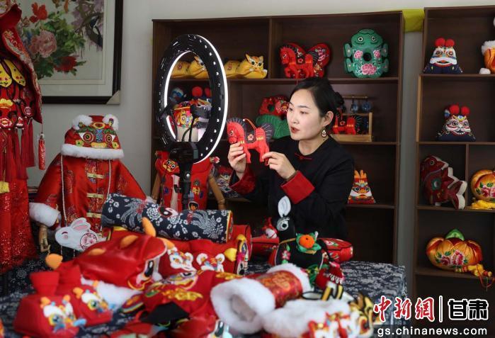 圖為國(guó)家級(jí)非物質(zhì)文化遺產(chǎn)慶陽(yáng)香包繡制代表性傳承人孟婷婷直播推介香包。盤(pán)小美 攝
