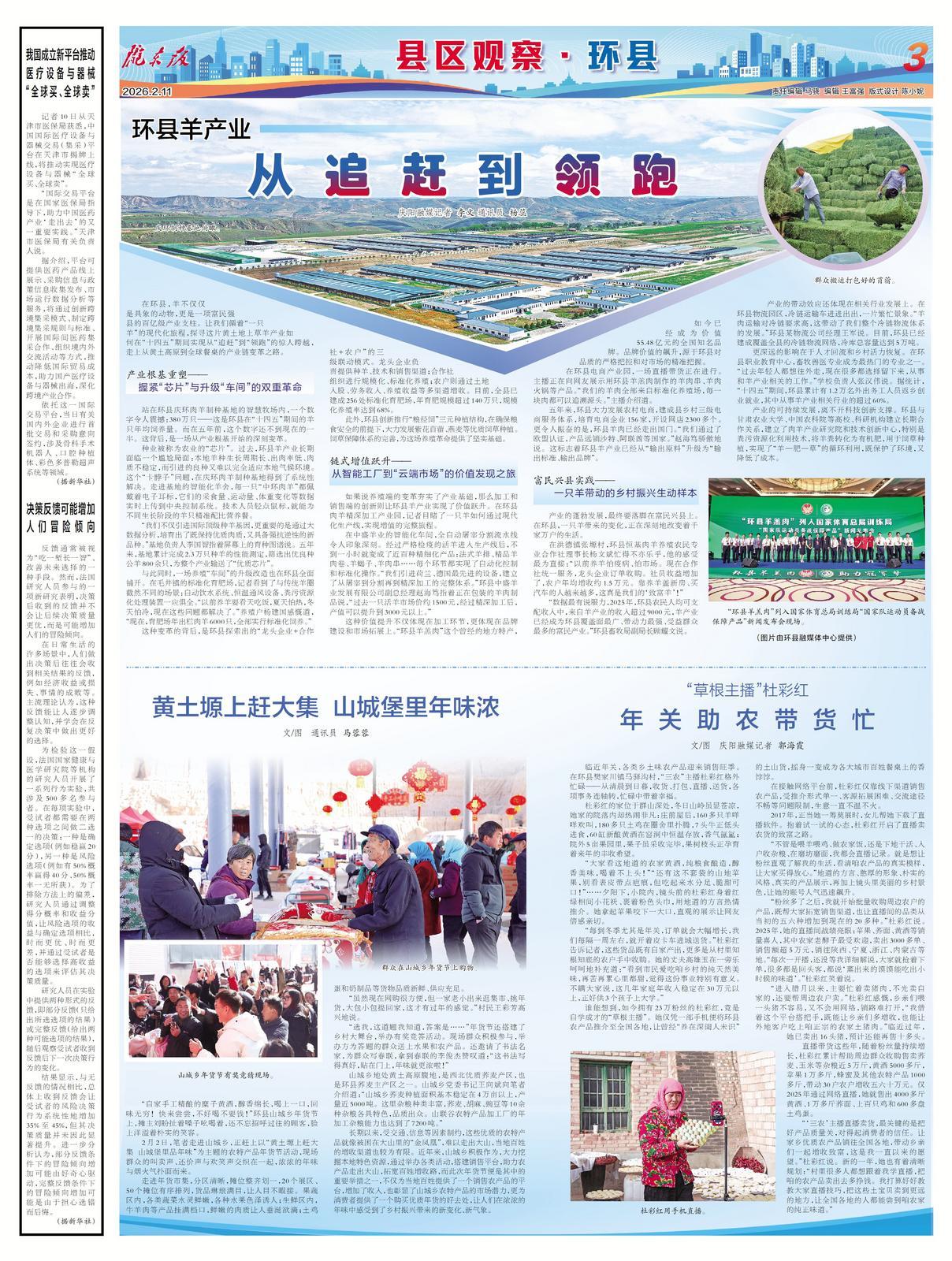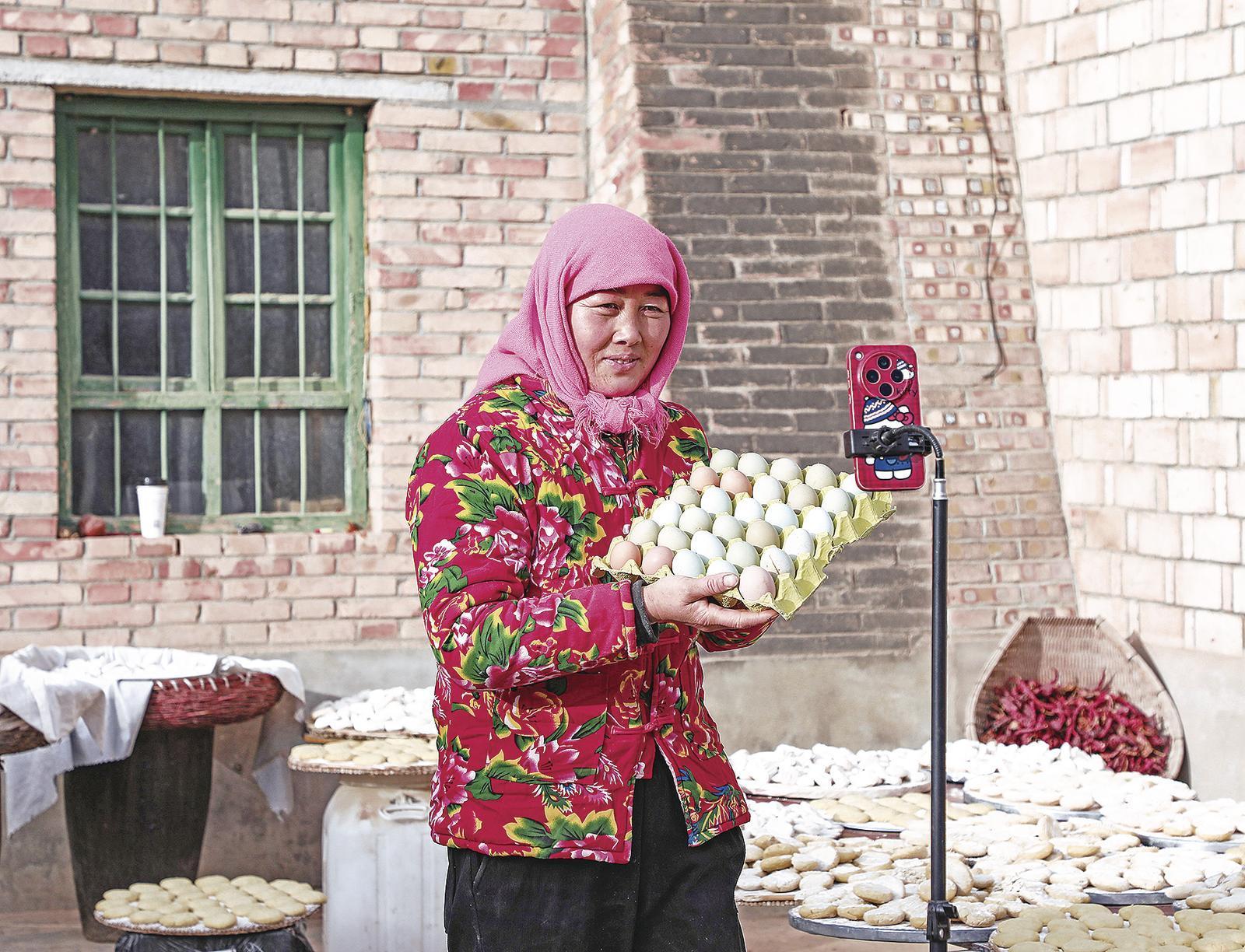 臨近年關(guān),各類鄉(xiāng)土味農(nóng)產(chǎn)品迎來銷售旺季。在環(huán)縣樊家川鎮(zhèn)馬驛溝村,“三農(nóng)”主播杜彩紅格外忙碌——從清晨到日暮,收貨、打包、直播、送貨,各項事務(wù)連軸轉(zhuǎn),忙碌中帶著幸福。