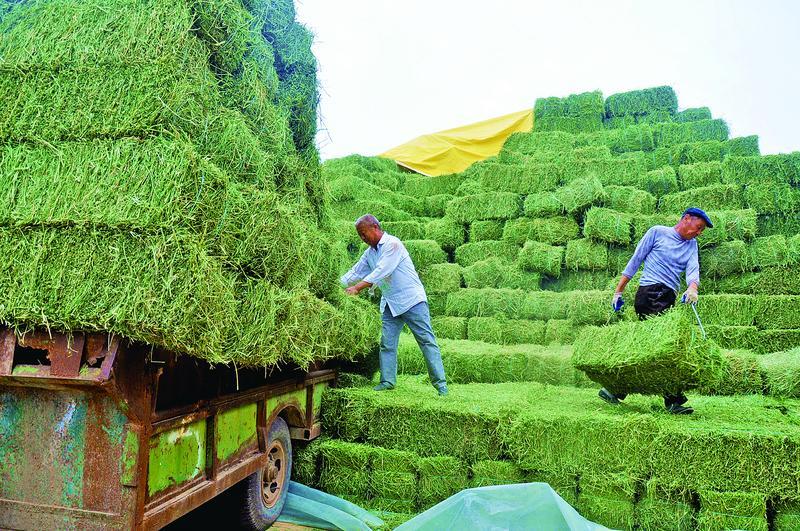 收割運(yùn)回的苜蓿堆積如山。