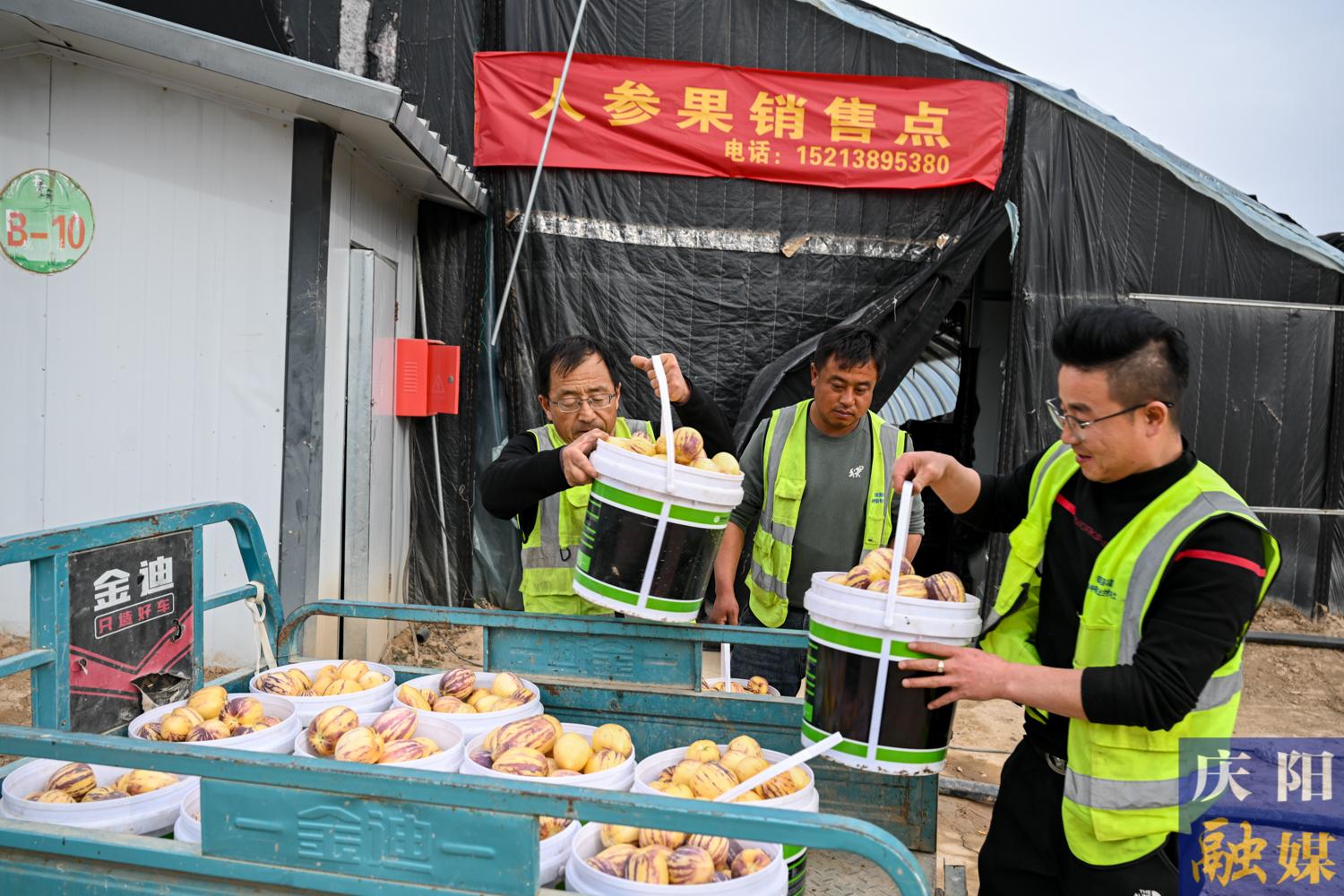 工人們將人參果運(yùn)往銷售點(diǎn)