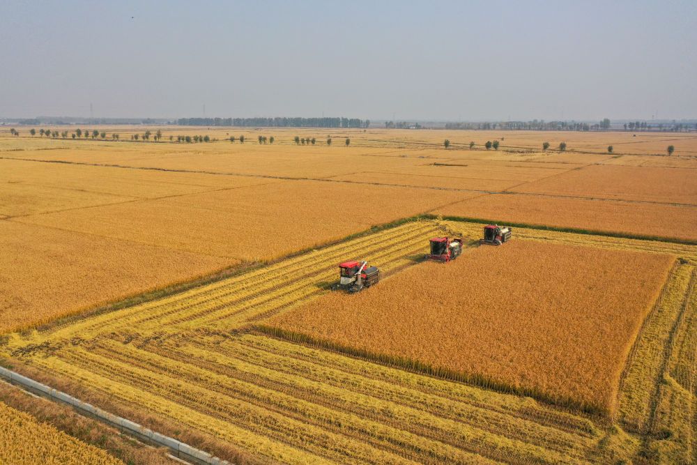 在吉林省公主嶺市,吉林省米兜種植農(nóng)民專業(yè)合作社進行機械化收割水稻作業(yè)展示(2025年10月14日攝,無人機照片)。新華社記者 張楠 攝