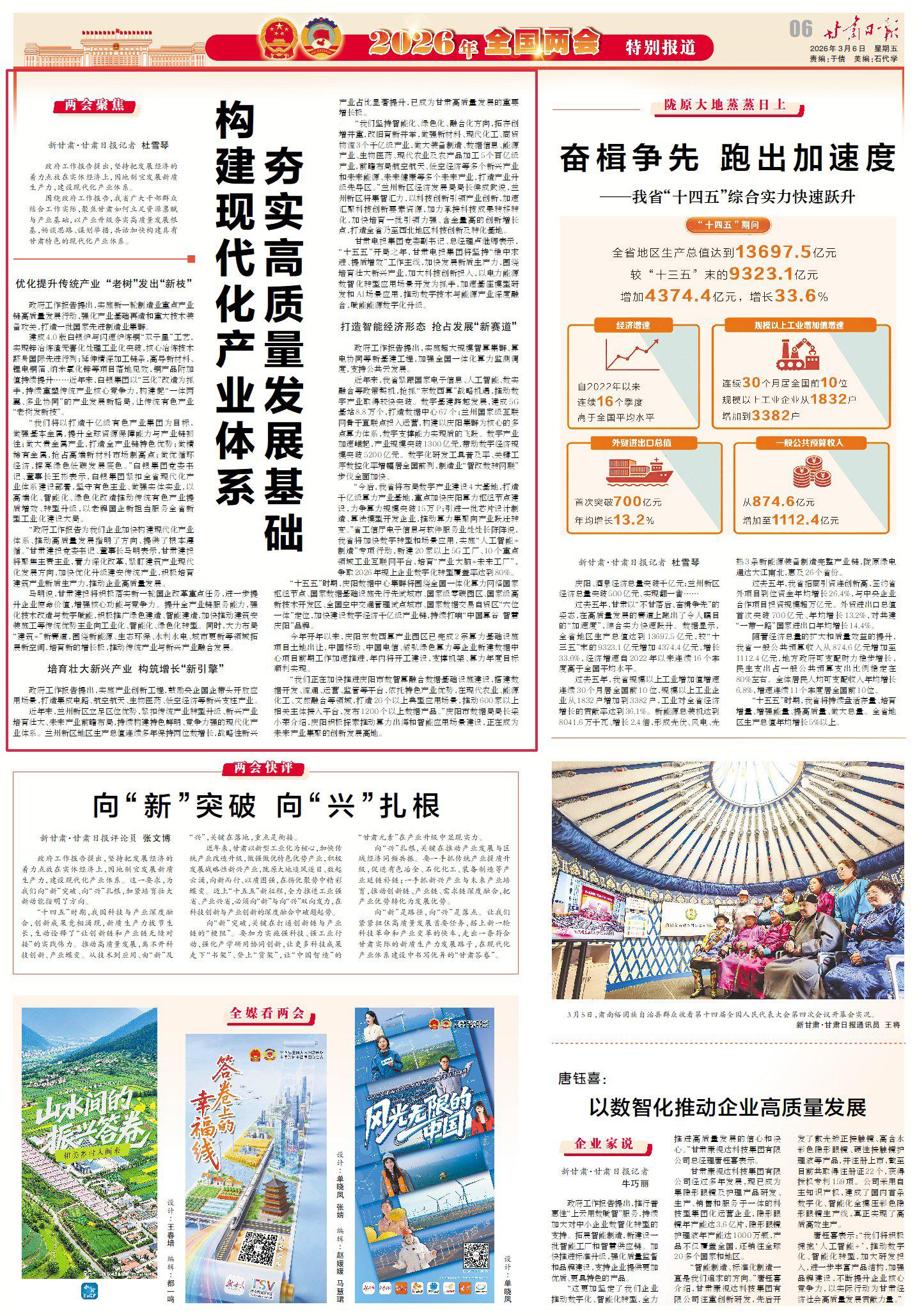 圍繞政府工作報(bào)告,我省廣大干部群眾結(jié)合工作實(shí)際,聚焦甘肅如何立足資源稟賦與產(chǎn)業(yè)基礎(chǔ),以產(chǎn)業(yè)升級(jí)夯實(shí)高質(zhì)量發(fā)展根基,暢談思路、謀劃舉措,共話加快構(gòu)建具有甘肅特色的現(xiàn)代化產(chǎn)業(yè)體系。