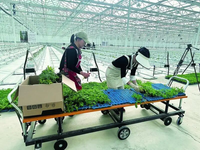 臨涇鎮(zhèn)祁廟村的蔬菜玻璃溫室內(nèi),務(wù)工人員為串收小番茄換苗
