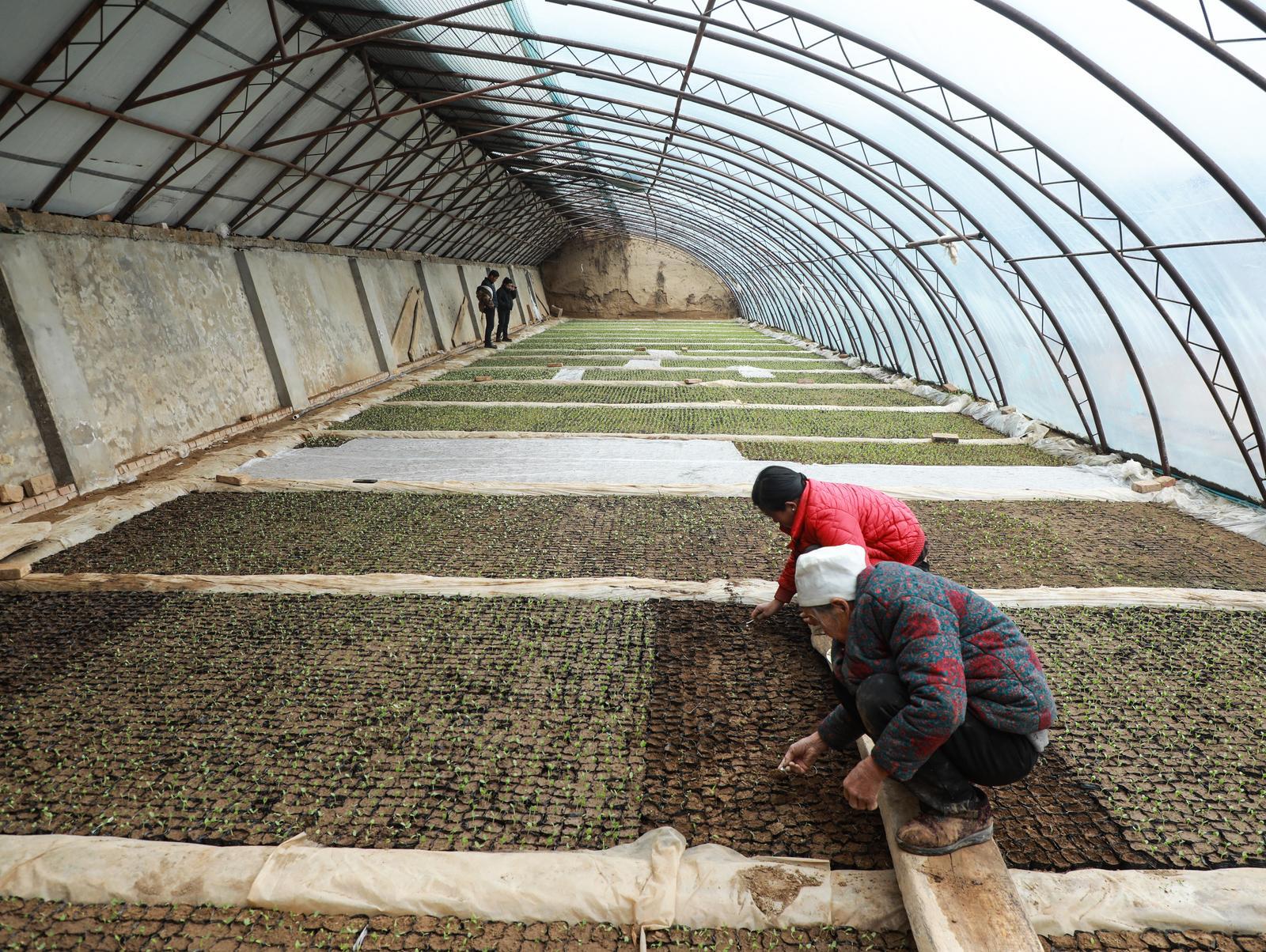 在孟家寨村育苗大棚里,同樣是一派熱火朝天的景象。種植育苗大戶袁玉懷一家人分工協(xié)作、各司其職,妻子精心打理苗床,母親細(xì)致灑水保濕,袁玉懷則專注把控育苗關(guān)鍵環(huán)節(jié),全家齊上陣守護(hù)著幼苗生長?!罢鲁跷寰烷_始育苗了,兩個大拱棚一次能育10萬株苗,品種以西瓜、甜瓜為主,主要供應(yīng)周邊農(nóng)戶?!痹駪研χf,幼苗長勢良好,清明前十天就能供農(nóng)戶栽植,僅育苗一項,一年就能帶來5萬元收入。除此之外,他還利用自家拱棚種植甜瓜、西瓜和時令蔬菜,多元種植讓日子越過越紅火。