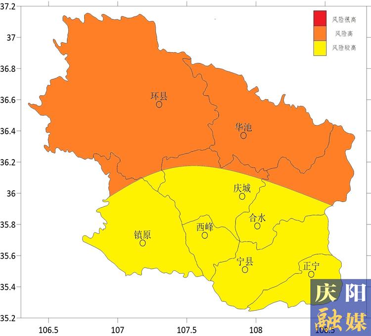 ▲慶陽市設施農業(yè)凍害風險預警等級分布圖。