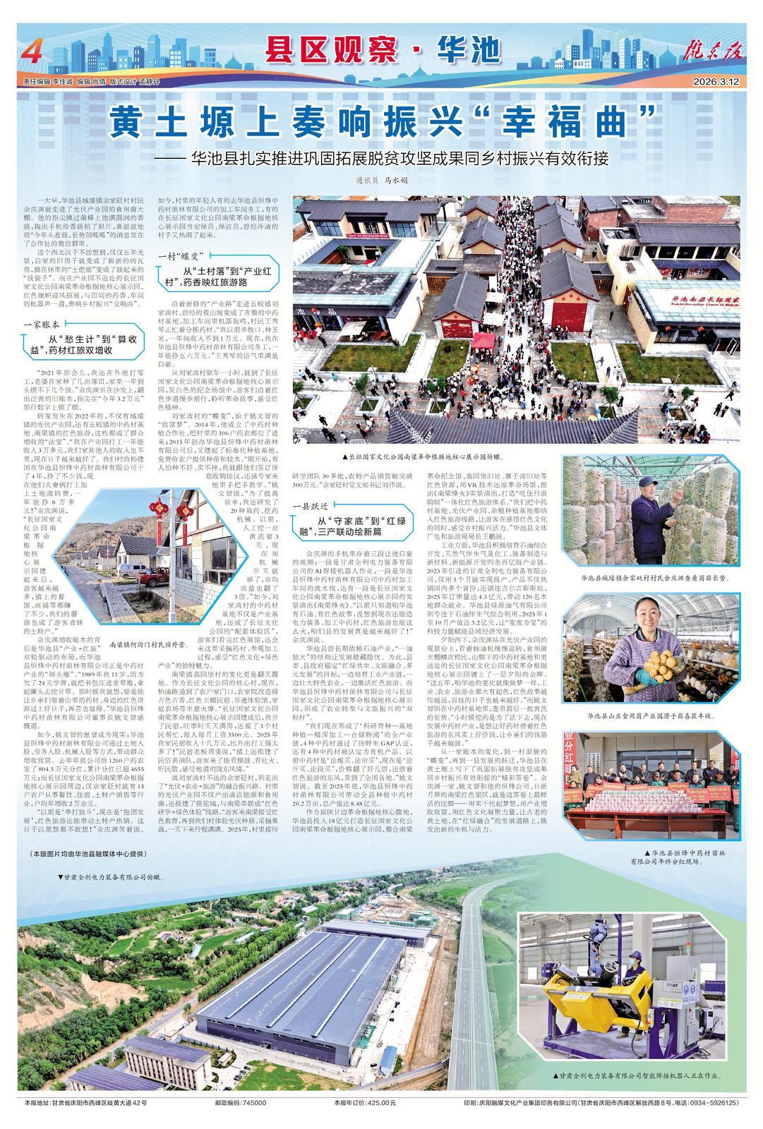 從一家賬本的變化,到一村面貌的“蝶變”,再到一縣發(fā)展的躍遷,華池縣在黃土塬上寫下了鞏固拓展脫貧攻堅成果同鄉(xiāng)村振興有效銜接的“精彩答卷”。余慶淵一家、姚文智和他的恒烽公司、日新月異的南梁紅色景區(qū),就是這答卷上最鮮活的注腳——用實干托起夢想,用產(chǎn)業(yè)增收致富,用紅色文化凝聚力量,讓古老的黃土地,在“紅綠融合”的發(fā)展道路上,煥發(fā)出新的生機(jī)與活力。