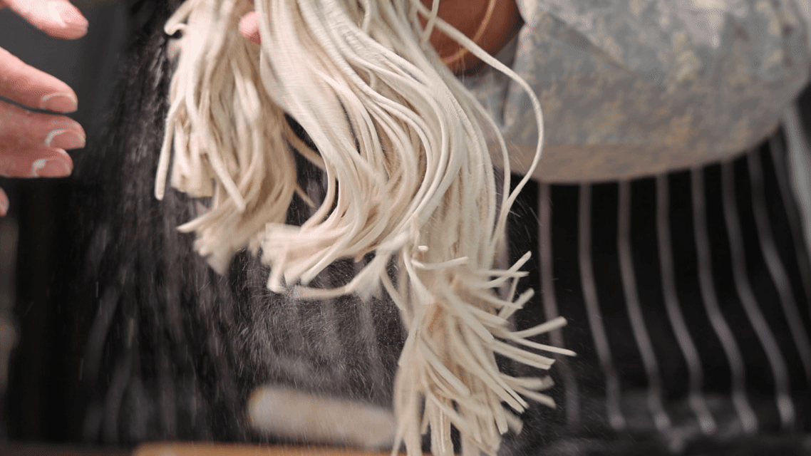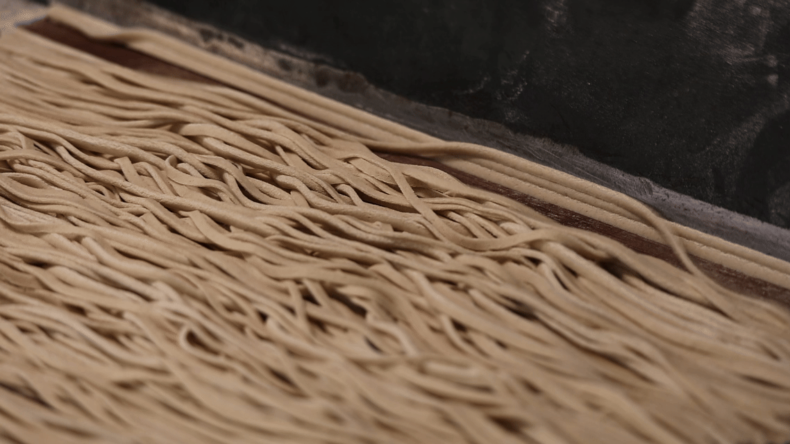 選料與和面是基礎(chǔ)。選用華池喬川鄉(xiāng)優(yōu)質(zhì)甜蕎,磨制的面粉細(xì)膩無渣,自帶谷物清香。傳統(tǒng)配比為七成蕎面、三成白面,兼顧筋道與口感。用 70℃左右溫水和面,邊倒水邊攪拌成雪花絮狀,再反復(fù)揉壓“撬面”,經(jīng)“三揉三醒”,直到面團(tuán)光如瓷、韌如棉,不粘手、不松散,這是面條筋道的關(guān)鍵。