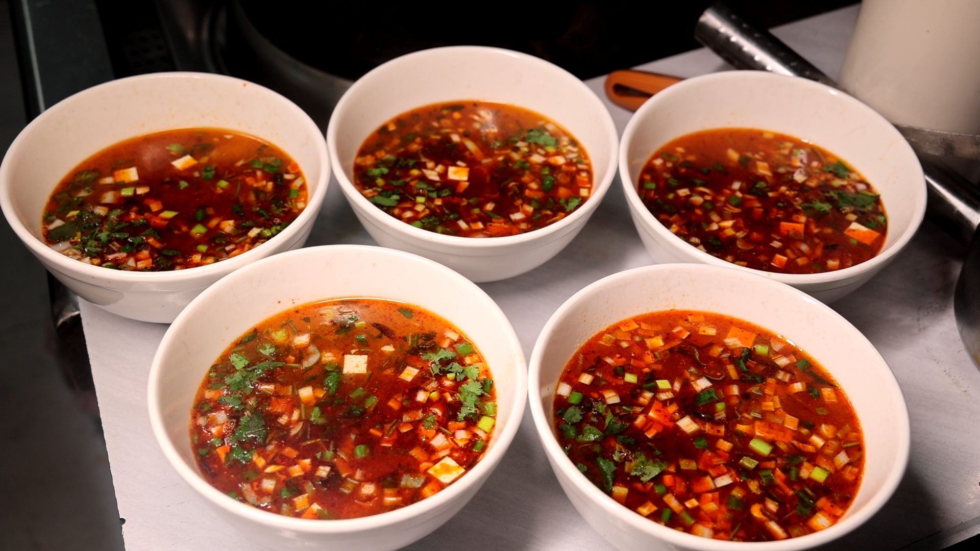 煮面與調(diào)湯是靈魂升華。剁好的面條直接撥入沸水鍋中,煮至浮起即刻撈出,避免軟爛。湯料分葷素兩種,羊肉臊子湯最具代表性:選用土山羊,切成肉丁,搭配土豆、胡蘿卜,加本地菜籽油煸炒,慢燉至湯汁濃郁、肉質(zhì)酥爛;酸湯則用漿水或食醋調(diào)制,清爽解膩。