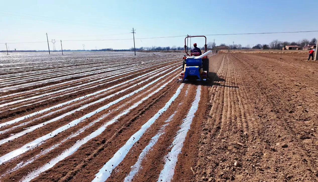 在示范區(qū)田塊間,搭載北斗導(dǎo)航系統(tǒng)的一體化覆膜機(jī)在田塊間勻速穿梭,旋耕、施肥、鋪膜、壓土多道工序一氣呵成。平整的田壟上,銀白色地膜順著地勢(shì)連片延伸,與遠(yuǎn)處的田埂、錯(cuò)落的村舍相映成趣。農(nóng)戶們?nèi)齼沙山M手持鐵鍬,翻土輕拍、加固膜邊,嫻熟的動(dòng)作間滿是對(duì)豐收的期盼。轟鳴的機(jī)械聲與田間的談笑聲交織相融,匯成了春日里最動(dòng)人的農(nóng)耕交響曲。