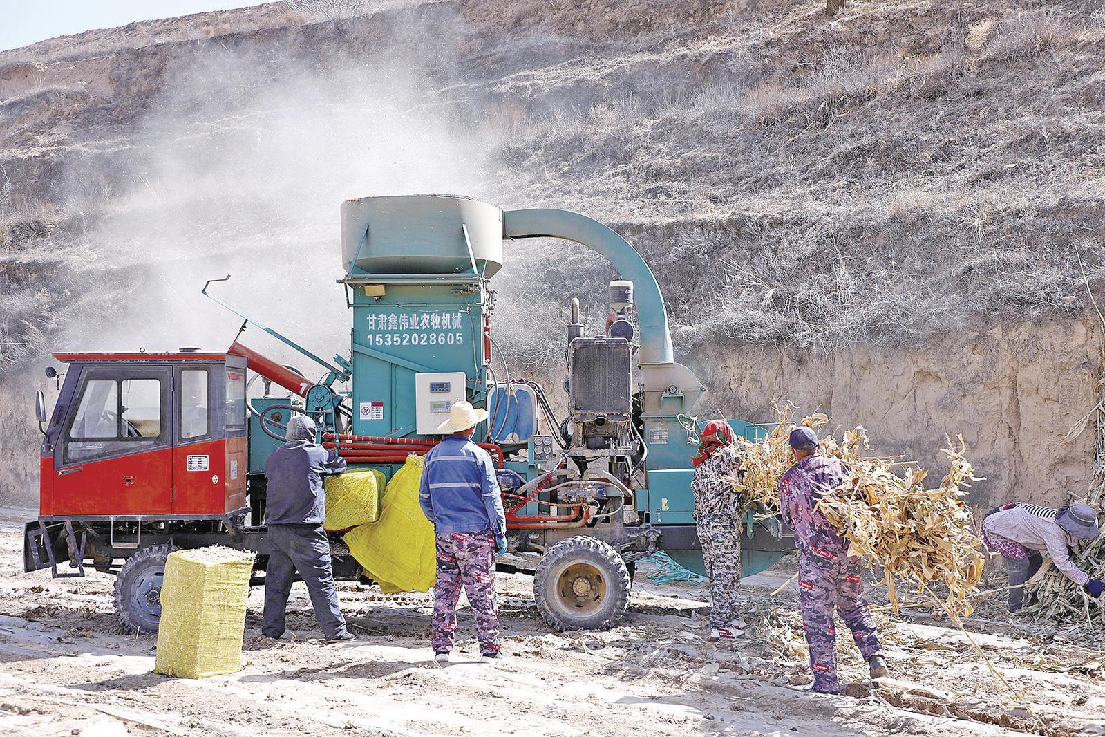天池鄉(xiāng)老莊灣村村民在打包玉米秸稈。 慶陽融媒記者 馬蓉蓉 攝