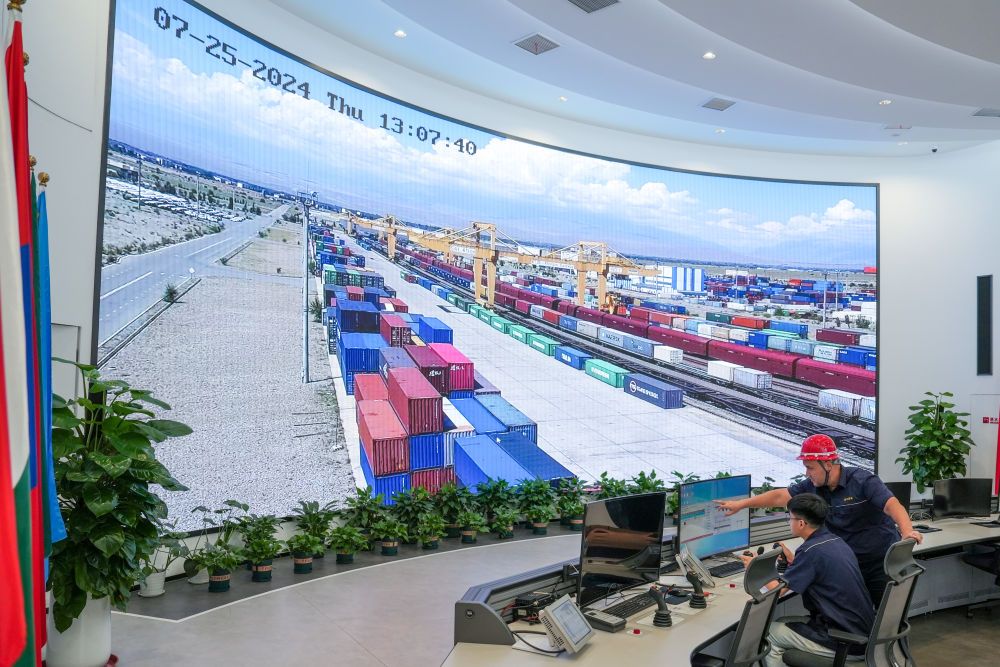 △ 2024年7月25日,在中哈(連云港)物流合作基地,工作人員通過(guò)“中哈物流場(chǎng)站”信息化跟蹤系統(tǒng)查看集裝箱運(yùn)輸情況。