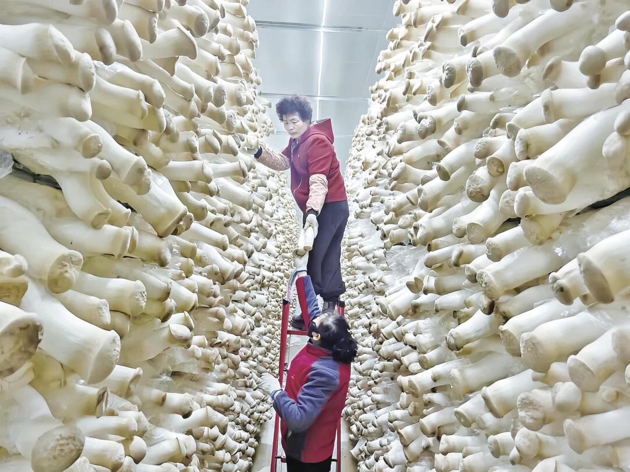 工人采摘杏鮑菇。