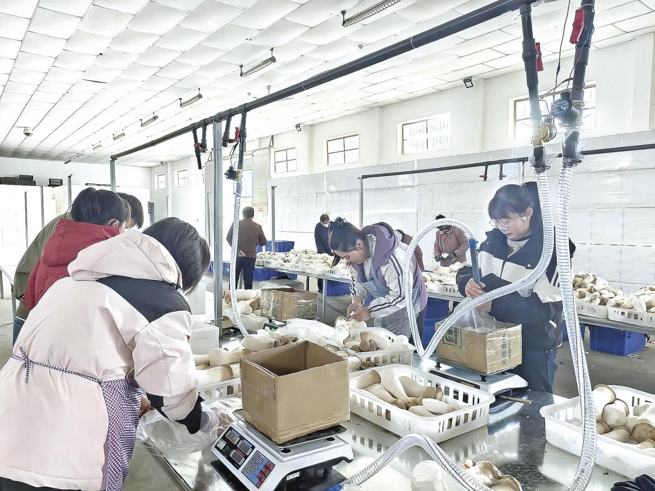 工人給杏鮑菇包裝、稱重。