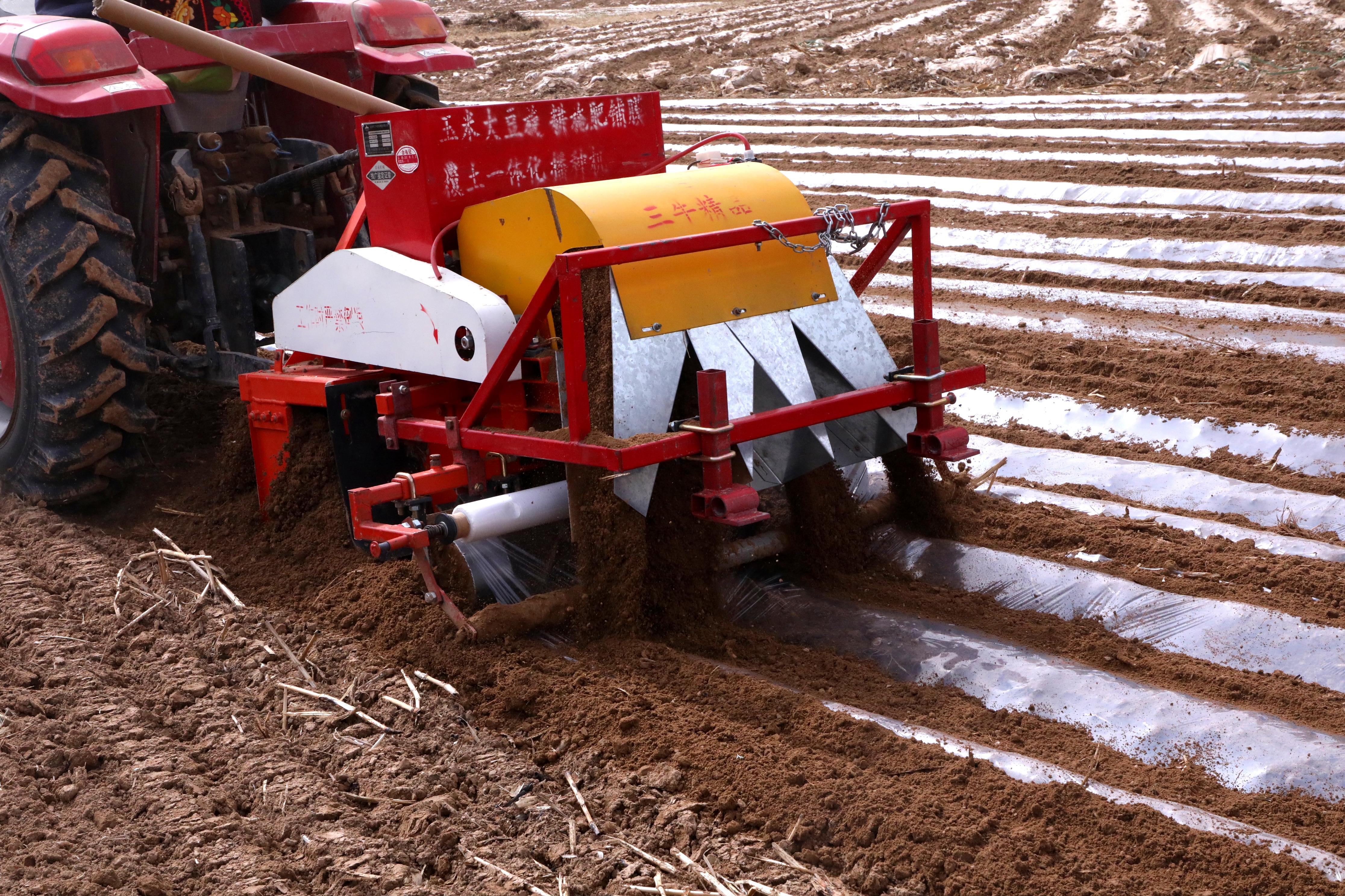 與此同時,魏家河村的田間地頭,旋耕覆膜一體機正有序作業(yè),起壟、鋪膜、壓土一氣呵成。農戶吳建財正和鄰里分工協(xié)作,壓實邊角、封堵縫隙,“趁著墑情好,趕緊把地膜覆上,鄰里互相搭把手,人多力量大?!?/p>