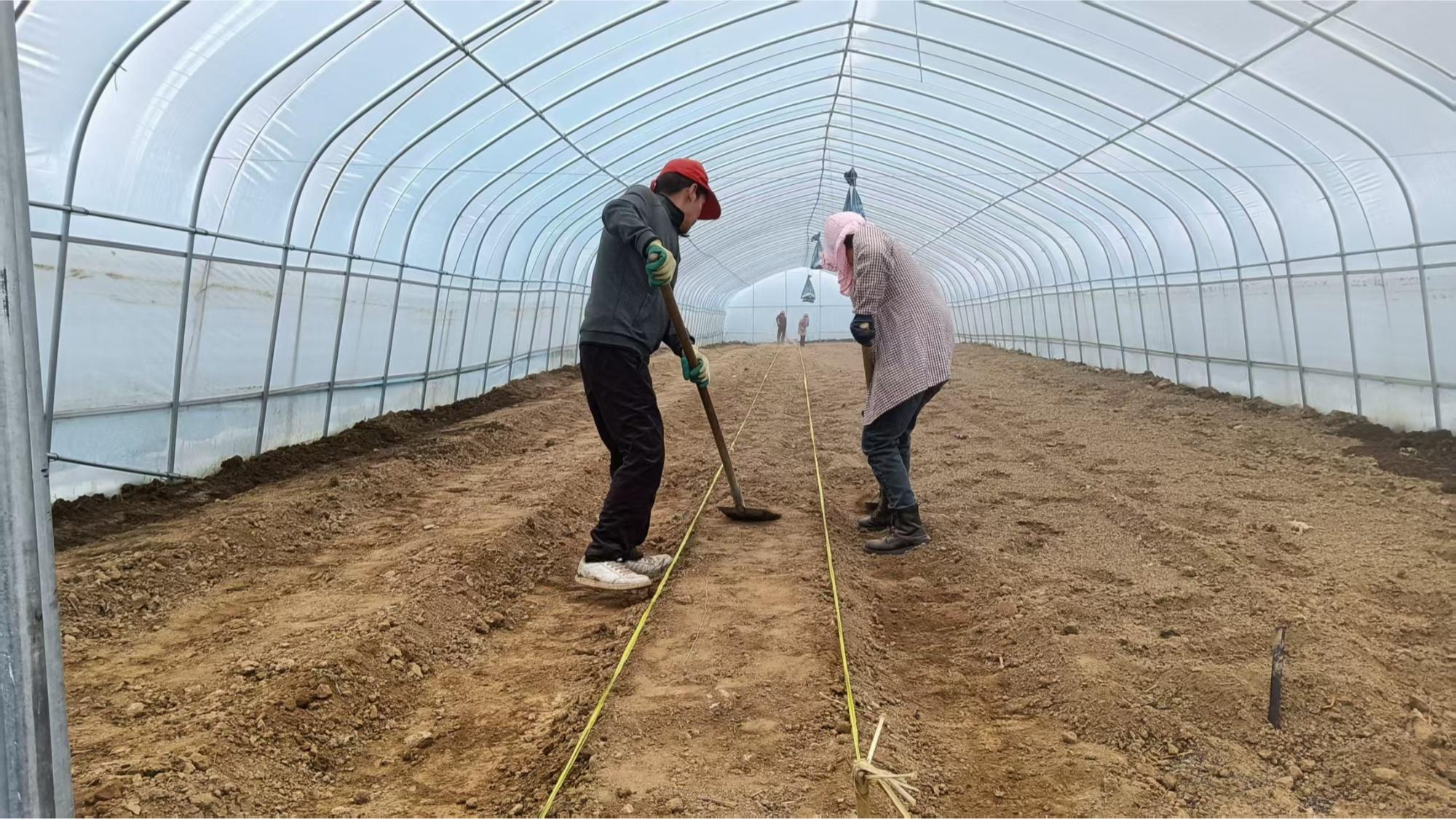 西峰區(qū)肖金鎮(zhèn)胡同村村民在大棚中整地起壟(西峰區(qū)融媒體中心供圖)