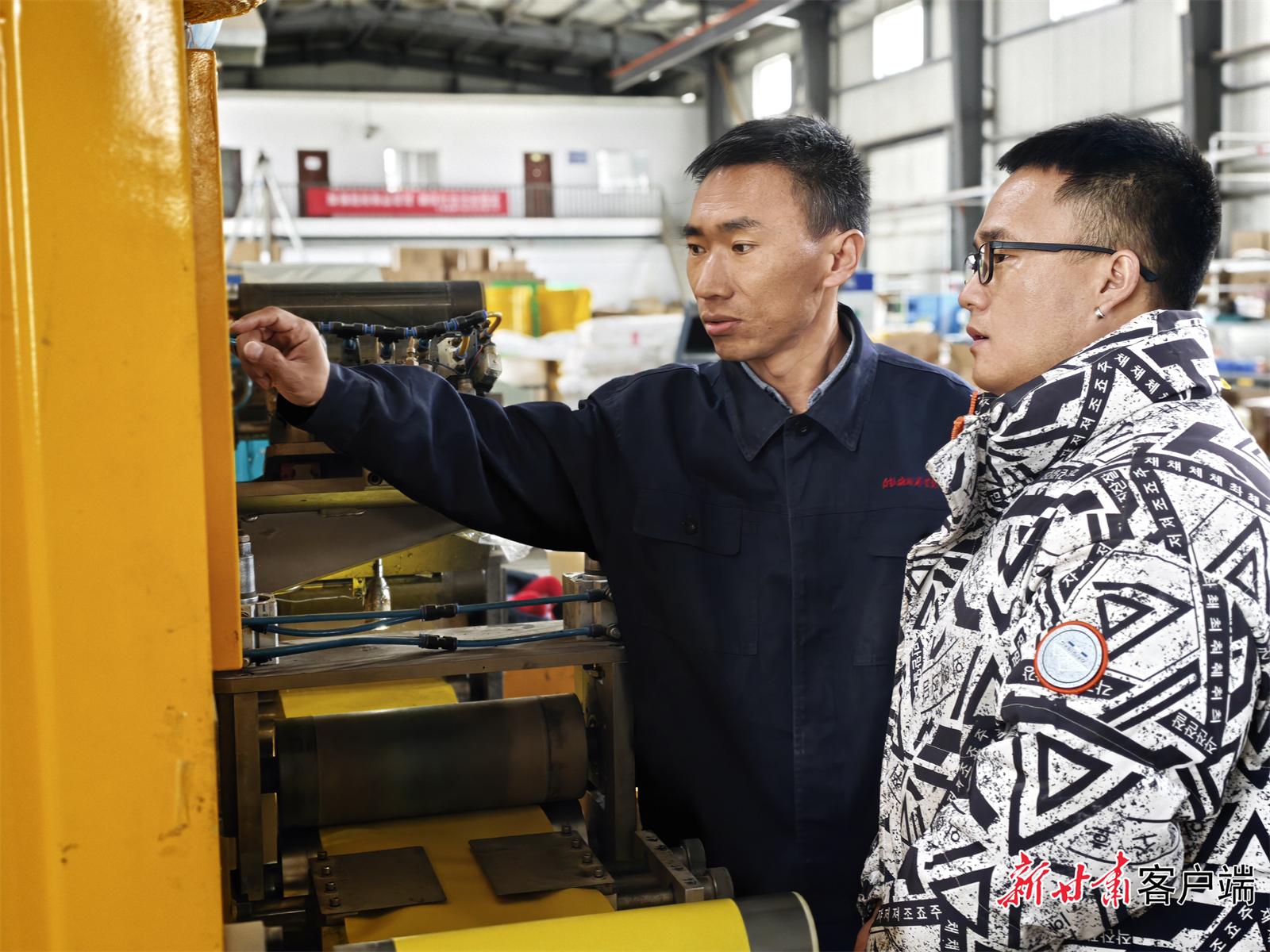 科技專員劉生壽(左一)與甘肅盈騰節(jié)能科技有限公司技術負責人趙文強在討論工作。(新甘肅·甘肅日報記者 吳涵)