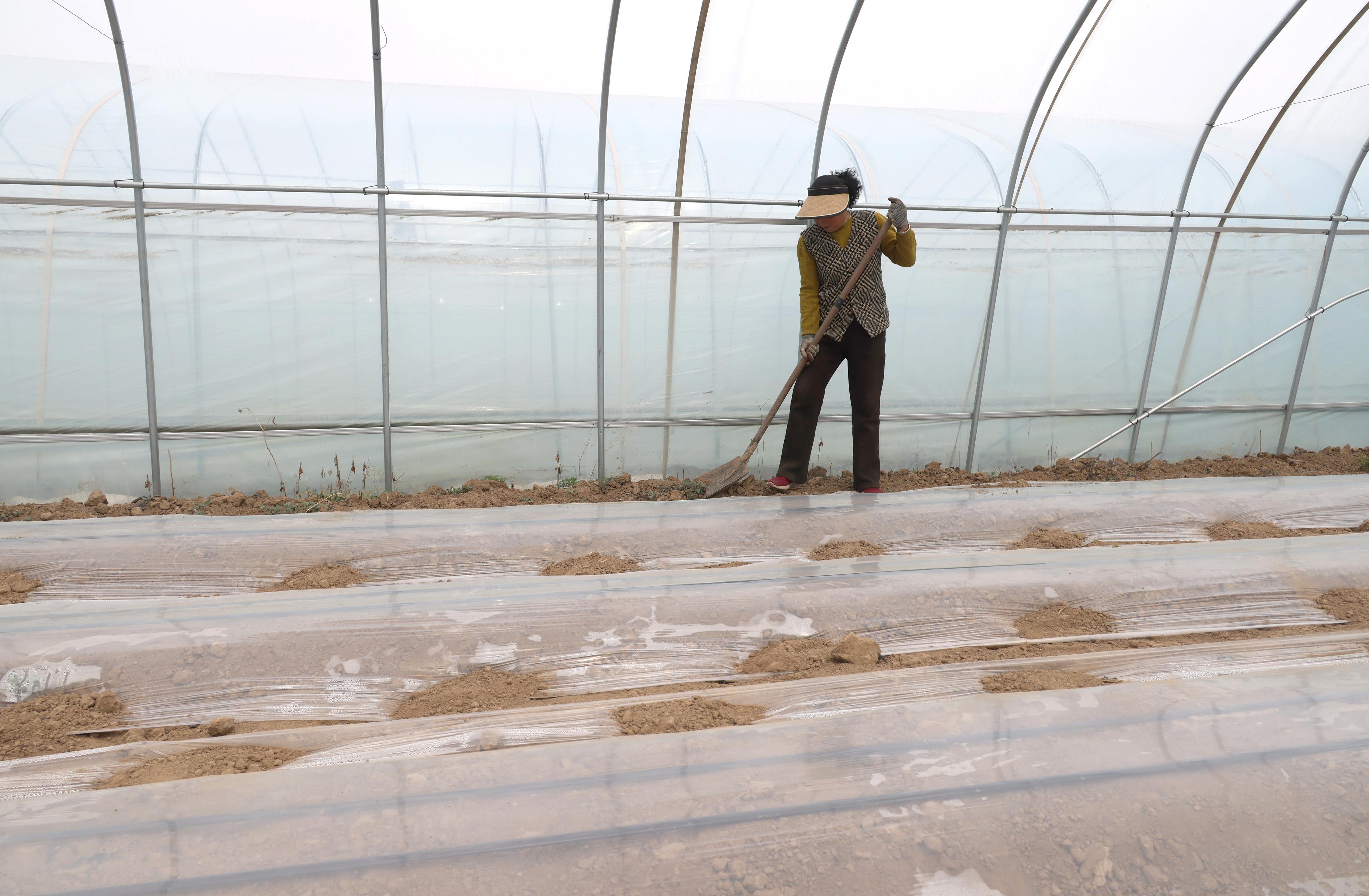 西峰區(qū)肖金鎮(zhèn)胡同村村民在大棚中整地起壟