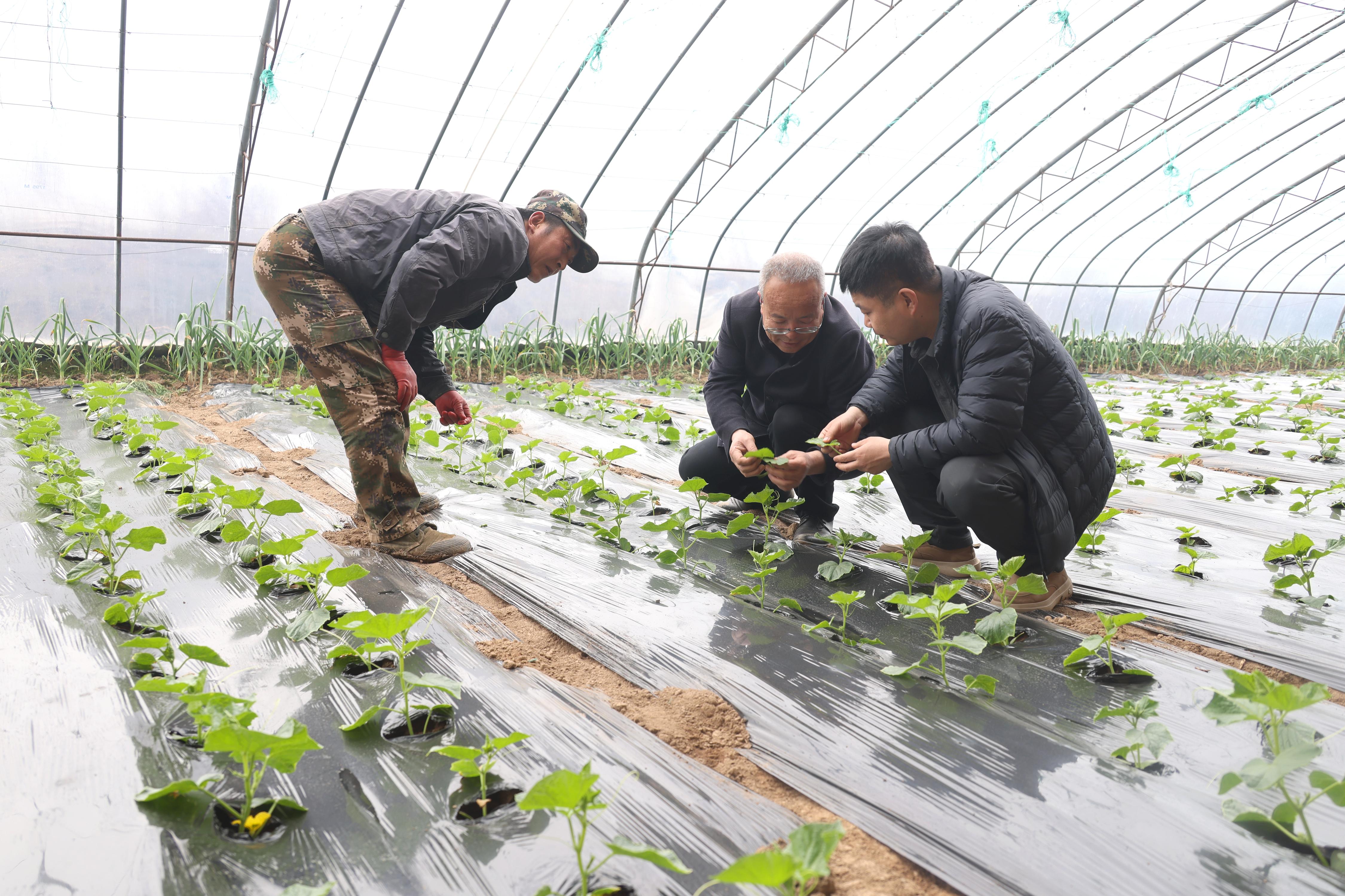 西峰區(qū)農(nóng)業(yè)產(chǎn)業(yè)化中心農(nóng)技人員在肖金鎮(zhèn)設(shè)施蔬菜基地黃瓜試驗(yàn)棚查看秧苗長(zhǎng)勢(shì)