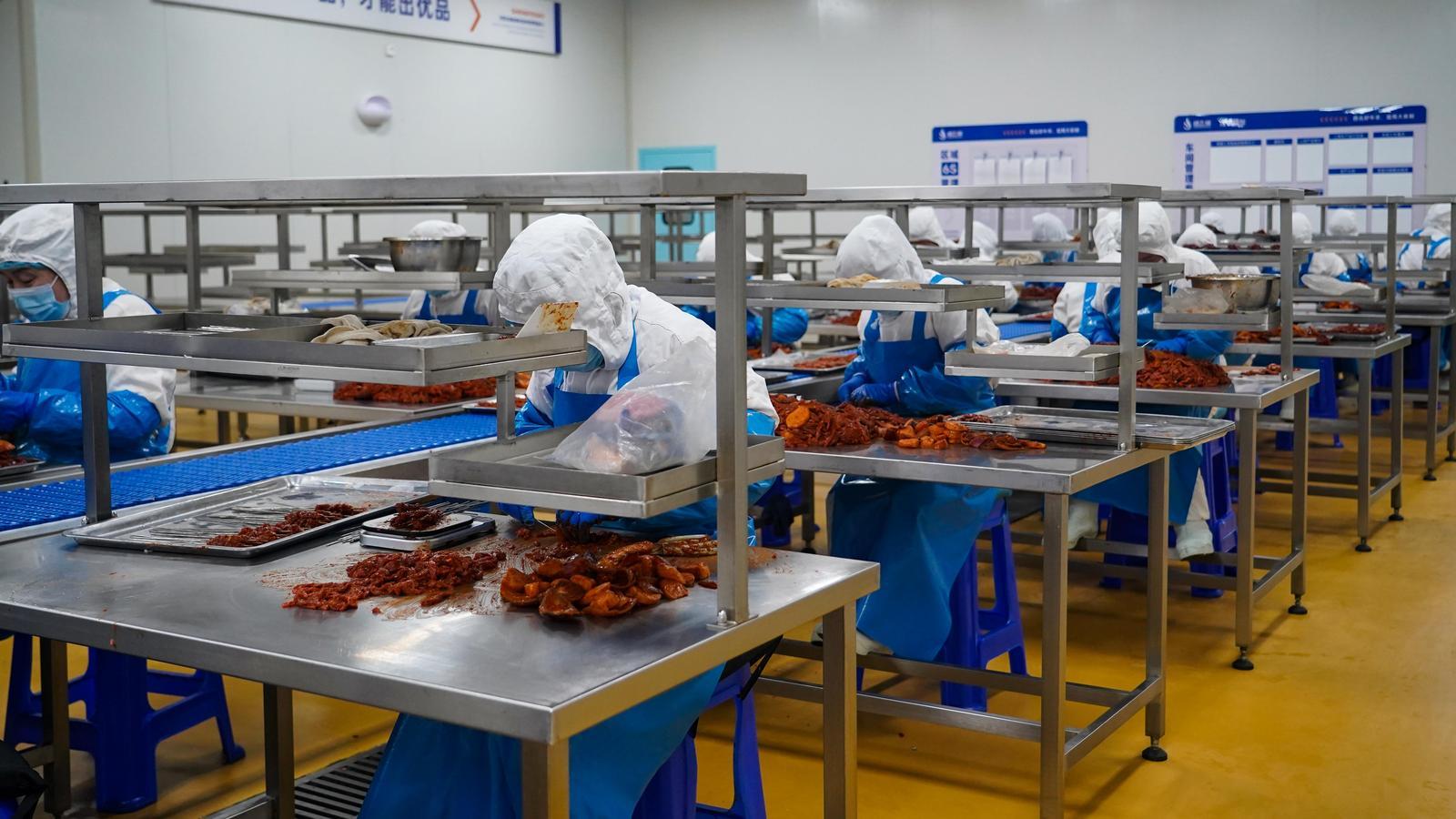 另一側(cè)新投產(chǎn)的生制車(chē)間里同樣一派熱火朝天,30多位工人同樣身著整潔的工作服,整齊地坐在操作臺(tái)前,手中的羊肉經(jīng)過(guò)熟練的切割、稱(chēng)重、穿串,再統(tǒng)一進(jìn)行品控驗(yàn)收裝袋,隨后進(jìn)入速凍環(huán)節(jié)。“生制車(chē)間現(xiàn)有30名新老員工,其中,老員工日均穿串2000多串,新員工也能達(dá)到600多串,每天總產(chǎn)量穩(wěn)定在4萬(wàn)串左右?!鄙栖?chē)間組長(zhǎng)谷桂梅的介紹,道出了生產(chǎn)線上的高效節(jié)奏。