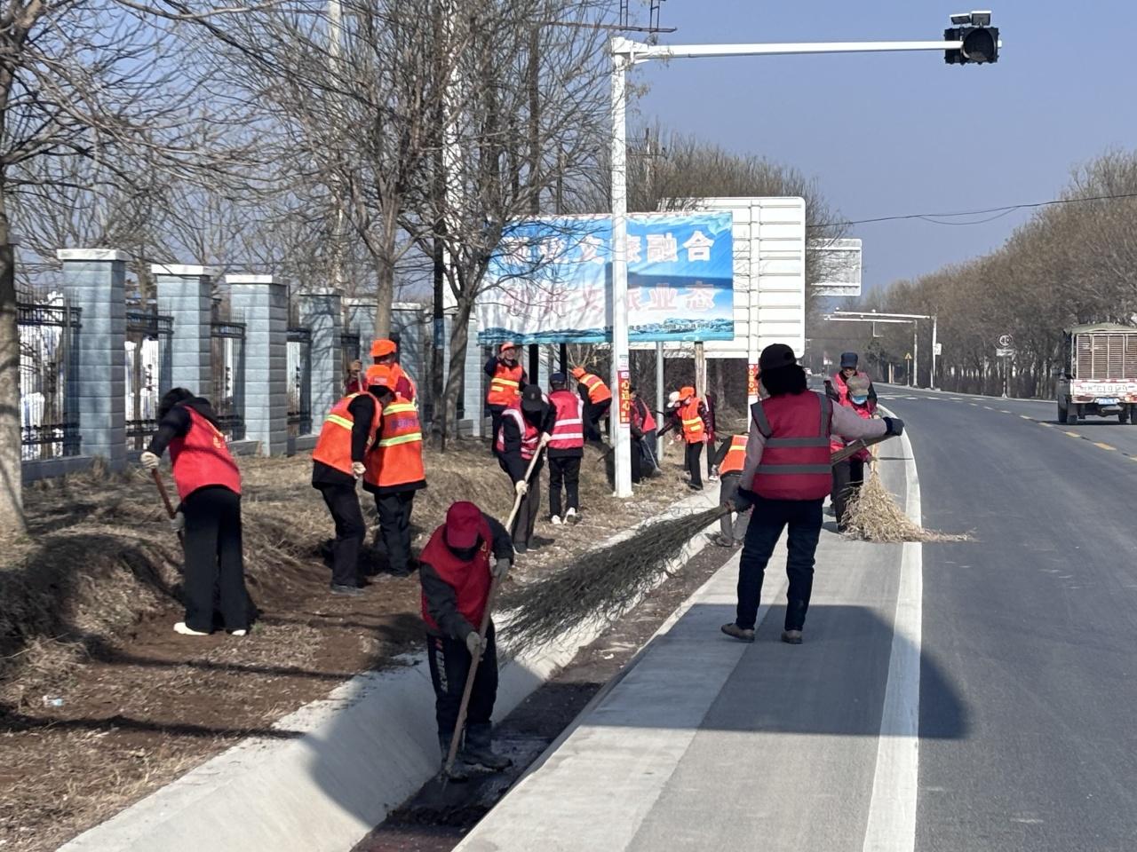 在南義鄉(xiāng)北莊村的環(huán)境整治現(xiàn)場(chǎng),黨員干部、公益性崗位人員、村民群眾分工協(xié)作、配合默契,有人清掃路面砂石與枯枝落葉,有人平整路肩邊坡,有人清運(yùn)雜物,有人修剪行道樹、栽種花草,熱火朝天的勞動(dòng)場(chǎng)景成為春日里動(dòng)人的風(fēng)景。