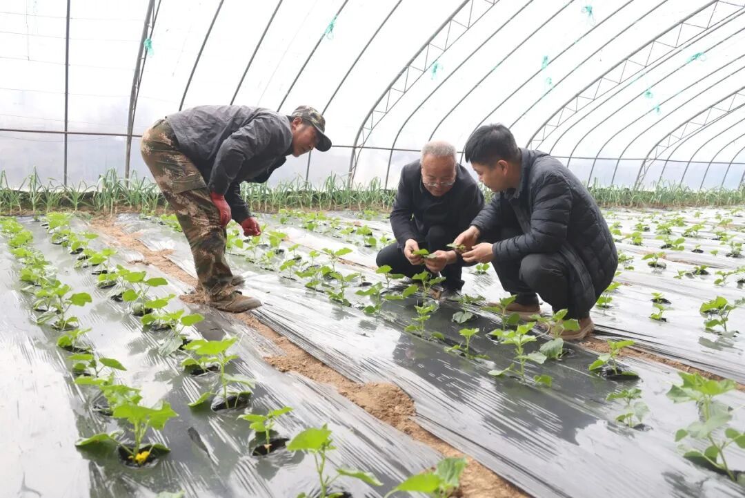 在種植戶高孔鵬的試驗(yàn)棚里,農(nóng)技人員俯身查看黃瓜秧苗長(zhǎng)勢(shì),仔細(xì)察看葉片、藤蔓狀態(tài),對(duì)比新品種與常規(guī)品種的差異。