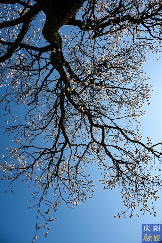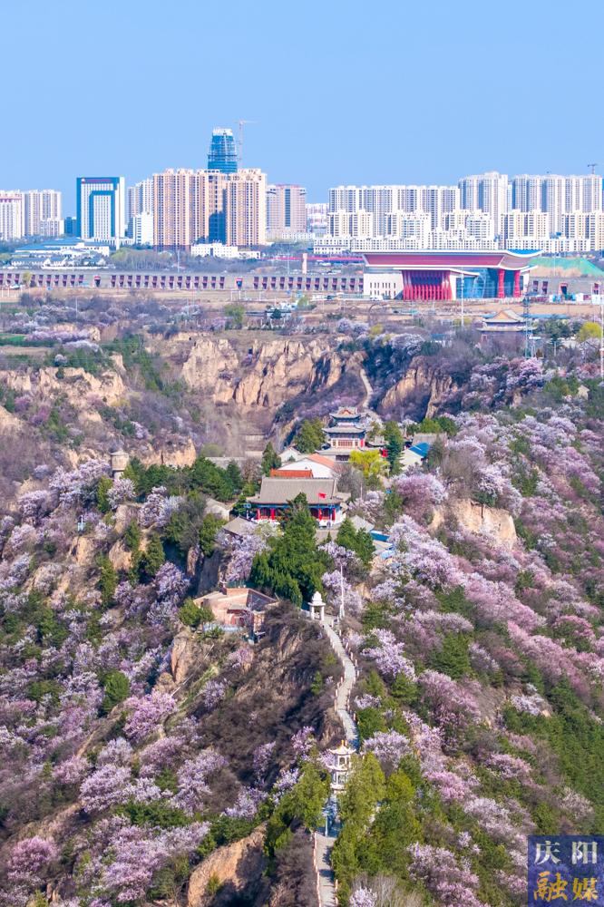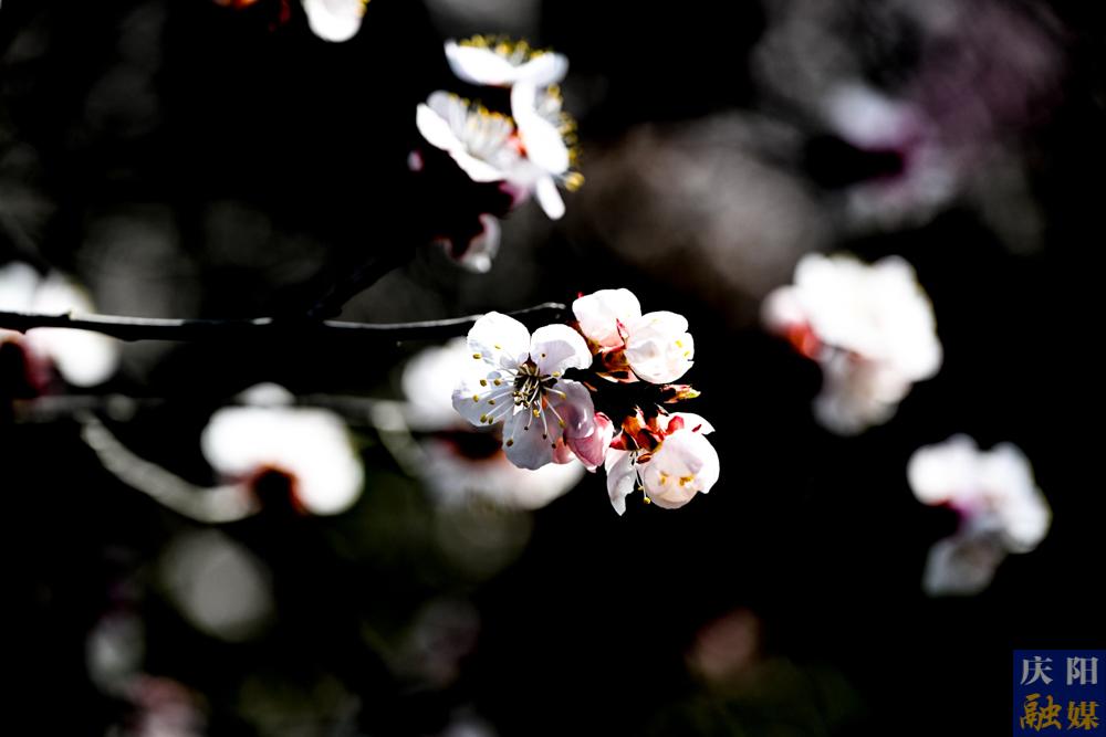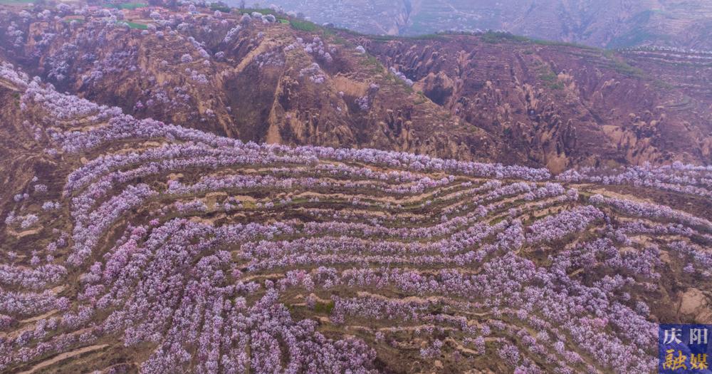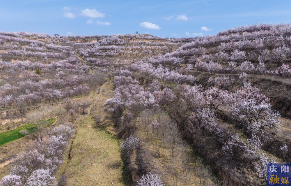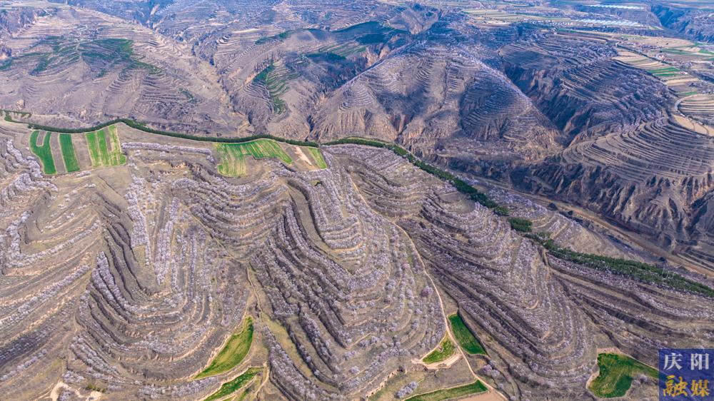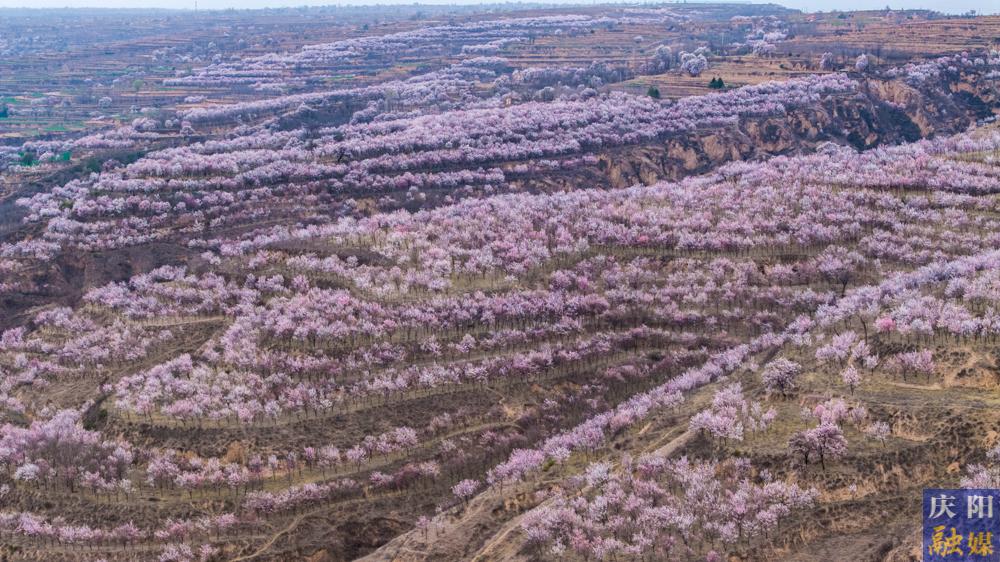 近日,慶陽大地氣溫回暖,各地杏花次第綻放,粉白花瓣綴滿枝頭,微風拂過,花枝輕搖,花瓣紛飛,漫山遍野如云似霞,與黃土溝壑、塬面梯田相映成趣,勾勒出獨有的高原春日畫卷 。