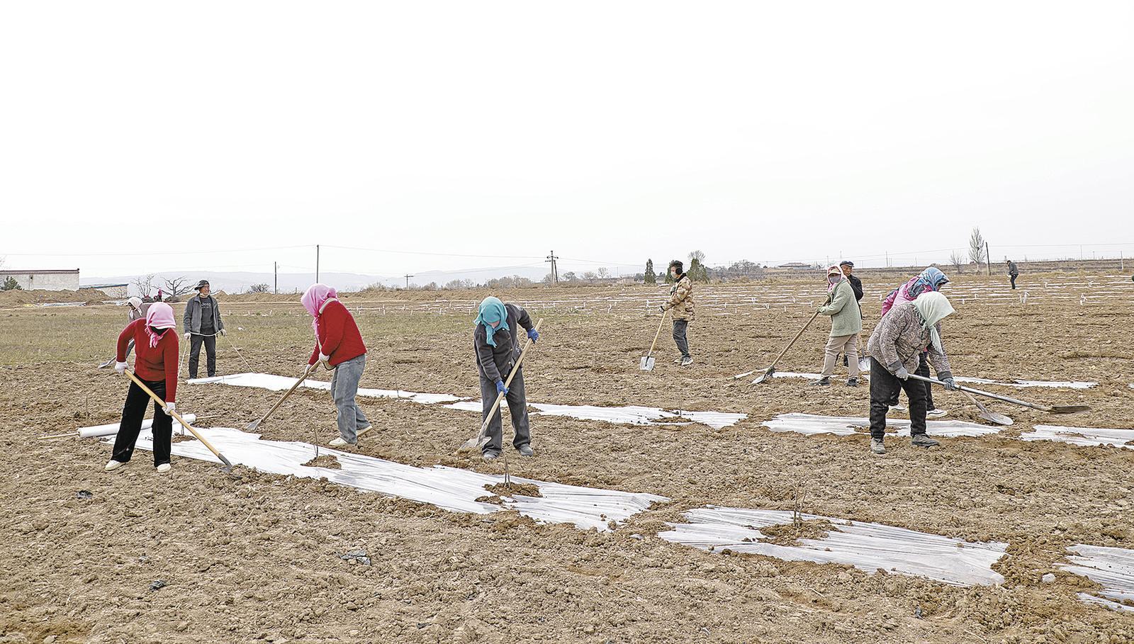 環(huán)城鎮(zhèn)千畝蘋果示范園覆膜現(xiàn)場(chǎng)。 慶陽(yáng)融媒記者 史珊 攝
