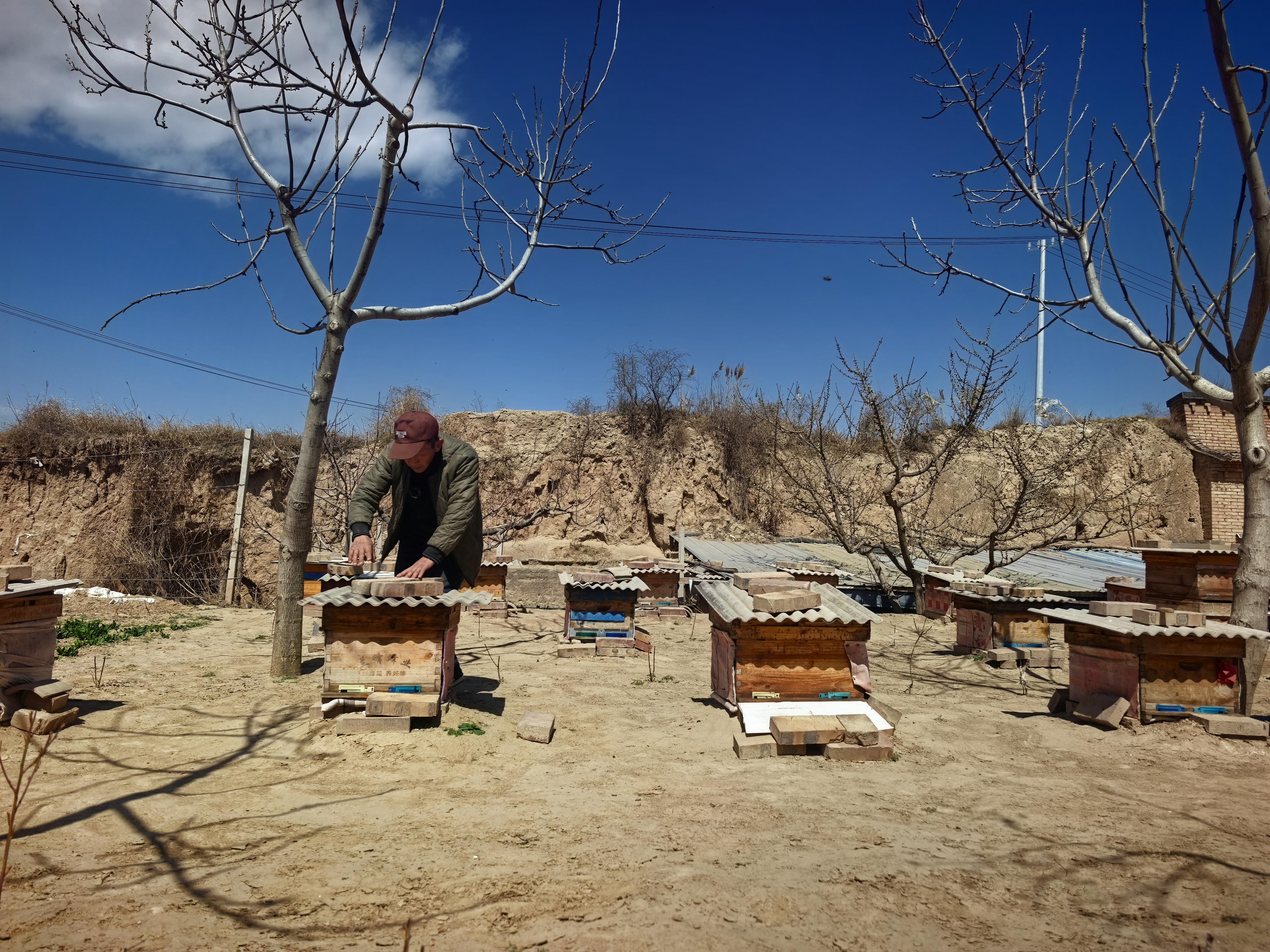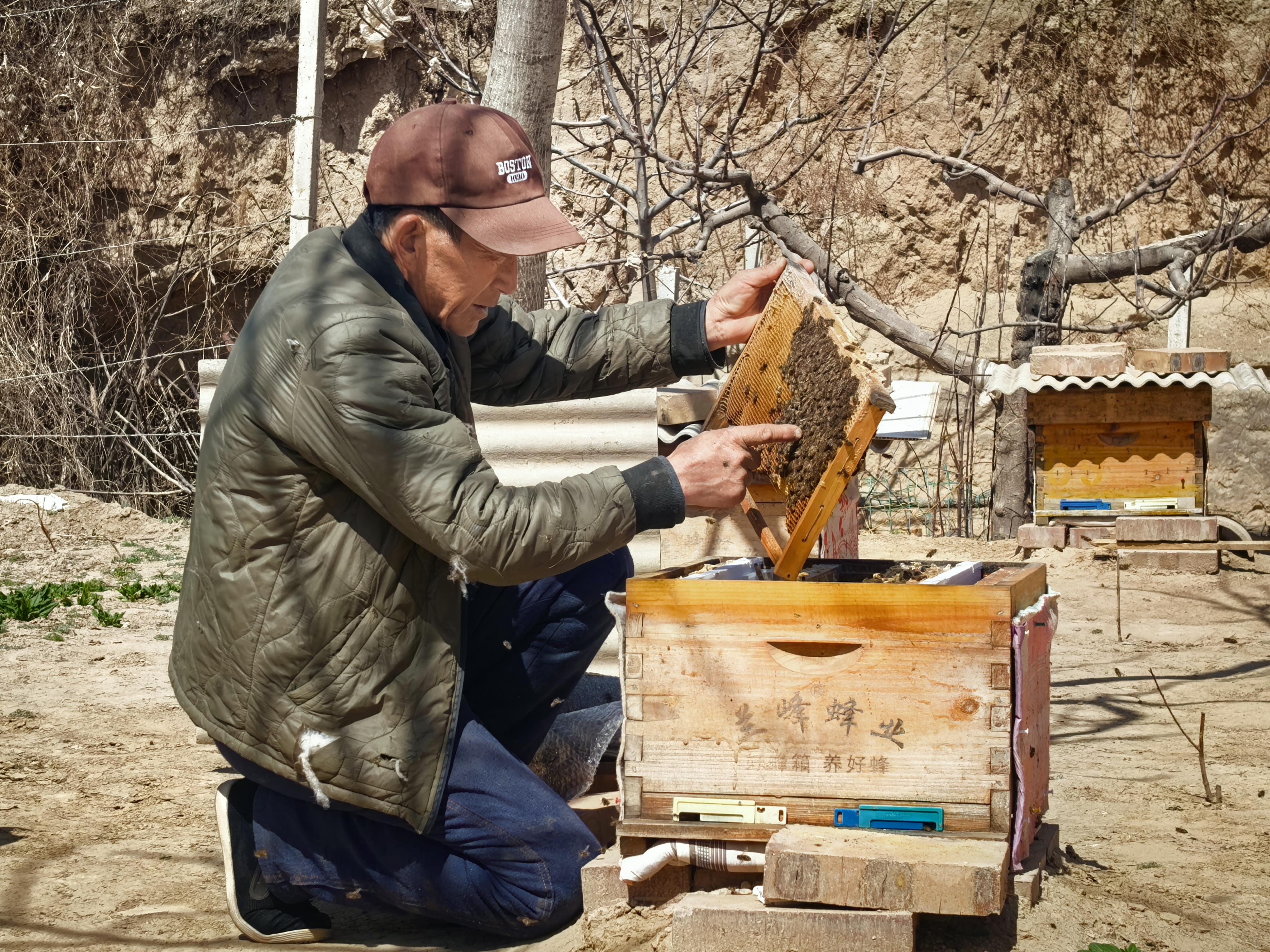 養(yǎng)蜂是慕克德的另一項收入來源。環(huán)縣境內(nèi)槐樹成林、蕎麥種植廣泛,槐花與蕎麥花期分明,晝夜溫差大,為蜜蜂采蜜、釀蜜提供了得天獨厚的自然條件。慕克德的這項手藝從二十幾歲就開始琢磨,斷斷續(xù)續(xù)幾十年,如今有了18箱蜜蜂,蜜源正是當(dāng)?shù)刈顑?yōu)質(zhì)的槐花和蕎麥花,一斤蜜賣到50元。他對蜜蜂的習(xí)性摸得透:吹北風(fēng)、下毛毛雨,蜜蜂采花勤,留糖多;吹南風(fēng),效果就差些。