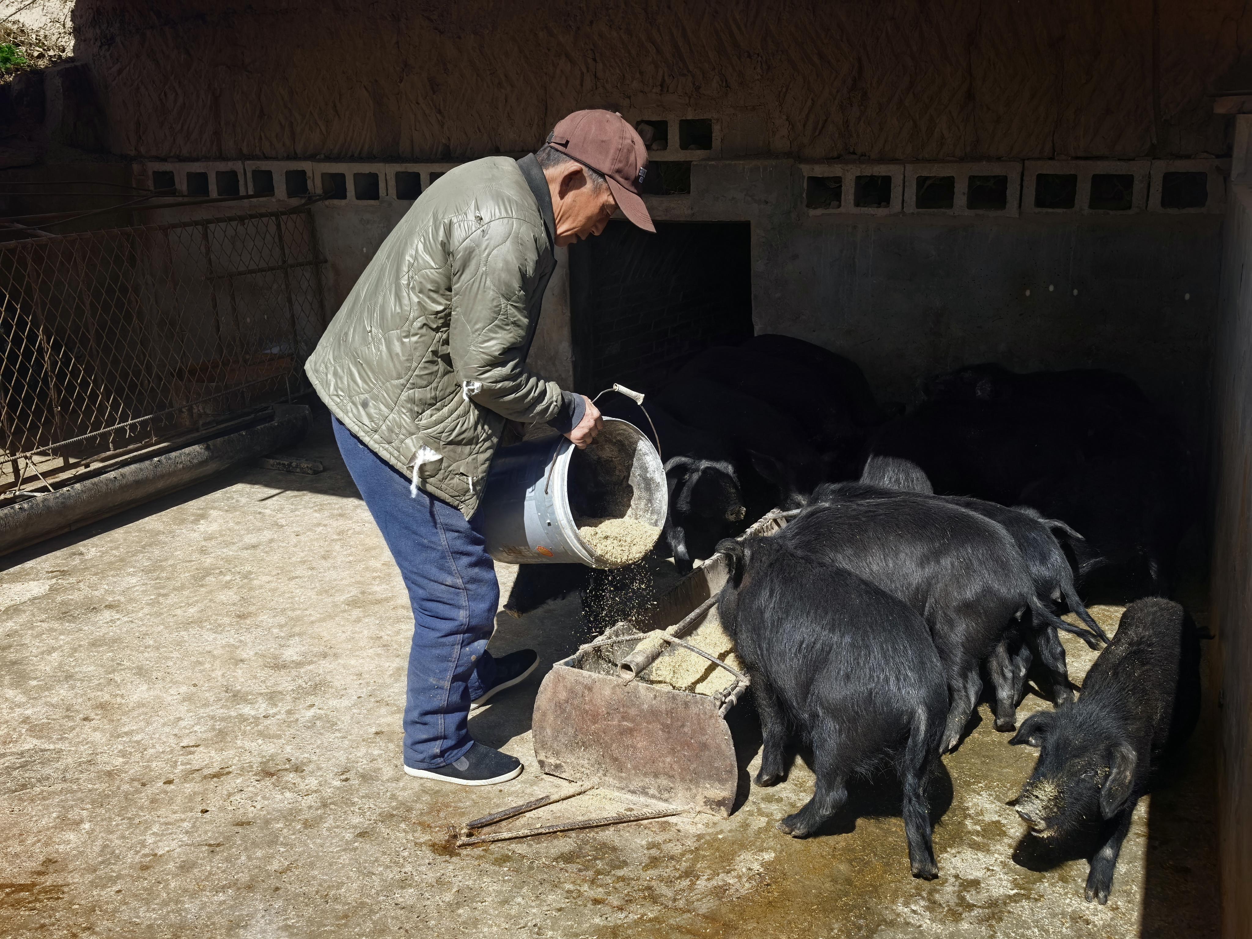 四年前,慕克德在微信群看到招工信息,去一家養(yǎng)豬場務(wù)工。兩個月里,他嘗到一種偏瘦的豬肉,“不愛吃肥肉,這個正合口味?!?022年農(nóng)歷三月廿六,他買回4只藏香豬,全部成活,次年農(nóng)歷十月便繁育了十幾頭。此后,他堅持自繁自養(yǎng)——成本低、風(fēng)險小,存欄量穩(wěn)定在50頭左右,出欄控制在50斤上下。飼料以玉米為主,自家的核桃樹葉也成了補充。為跑市場,他主動對接餐館,環(huán)縣一家酒店成了固定客戶?!叭ツ牮B(yǎng)豬收入3萬多元,今年基礎(chǔ)再拓展一下,養(yǎng)殖數(shù)量上再增加一點?!蹦娇说卤硎?。