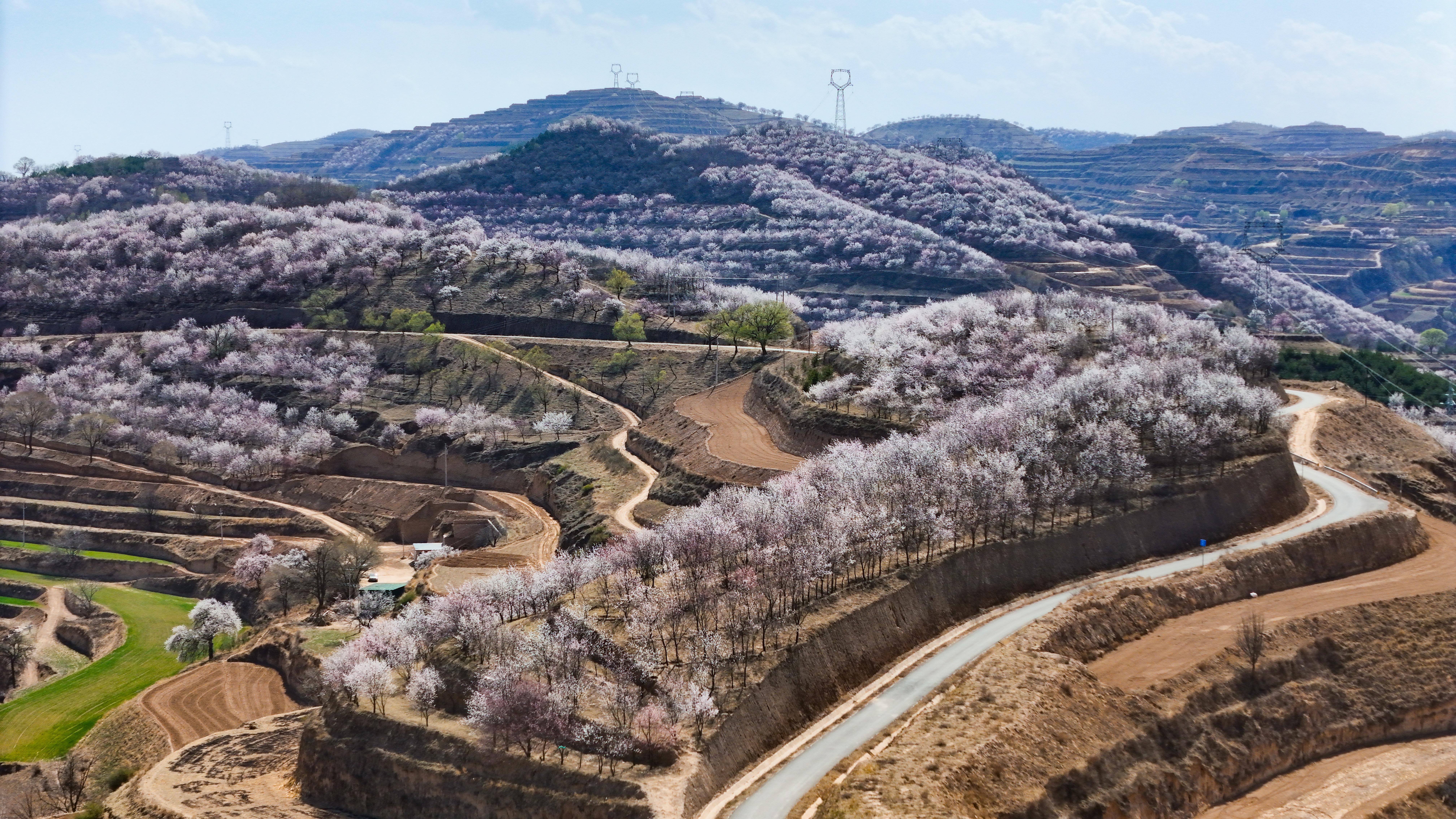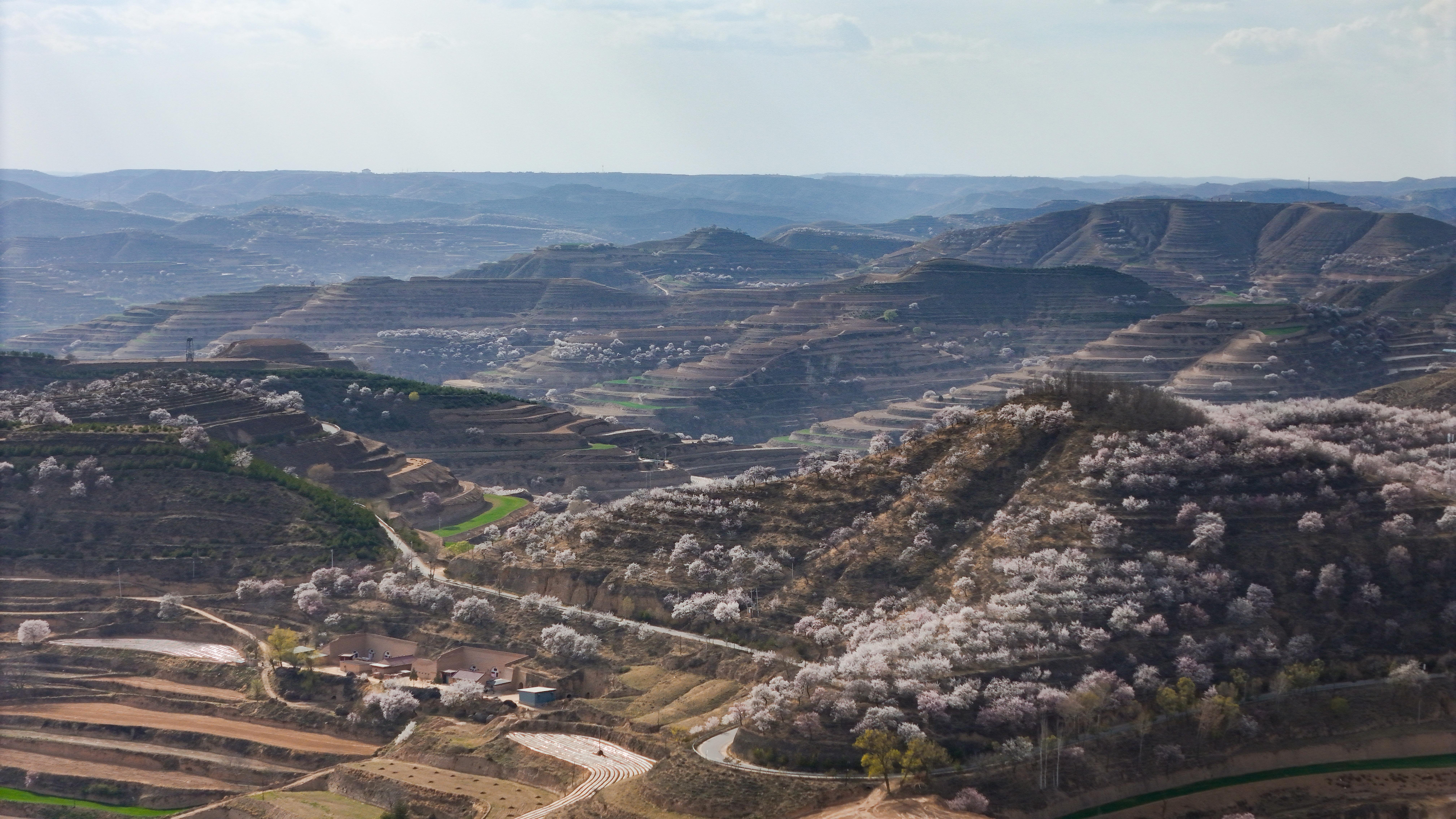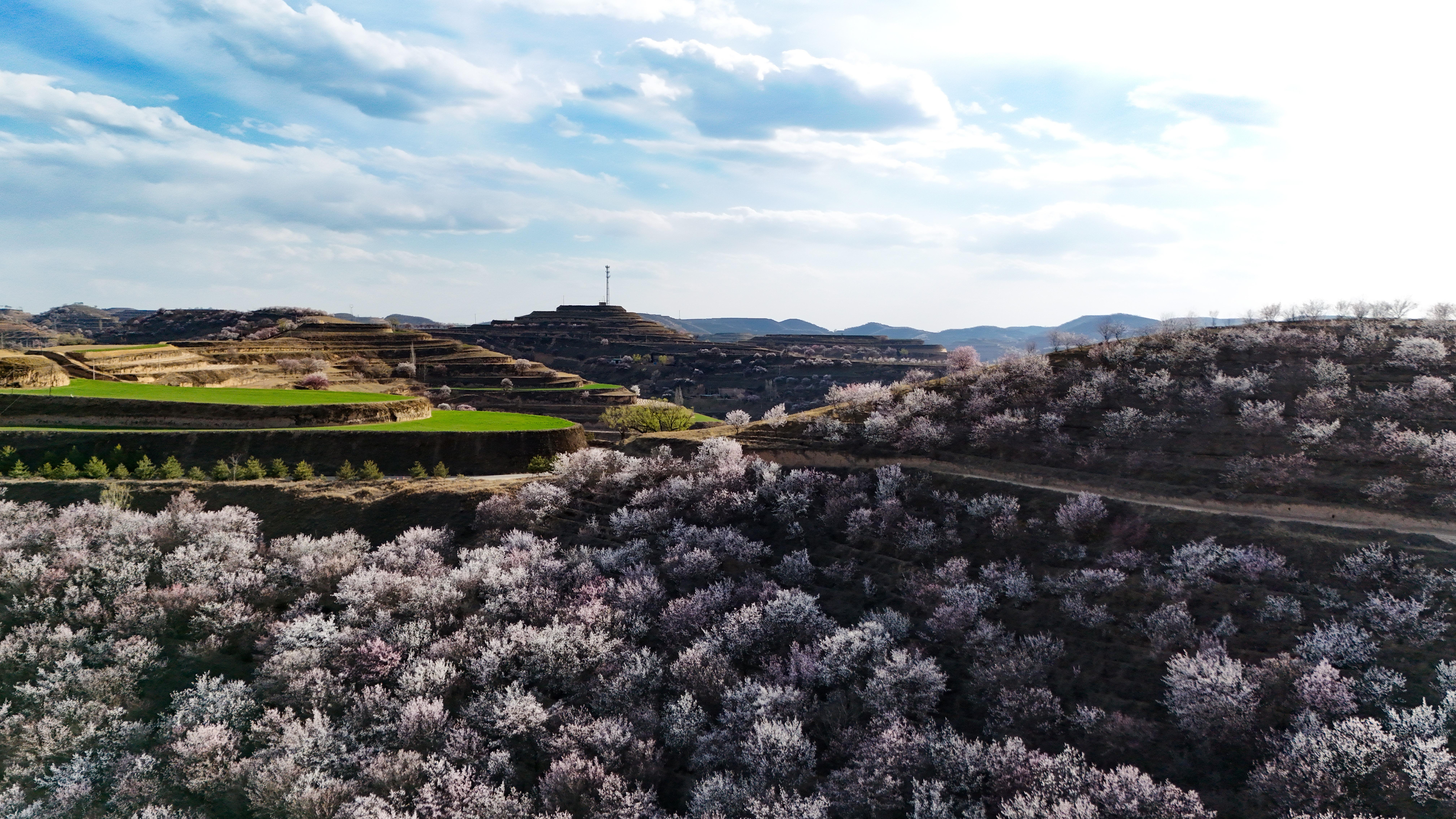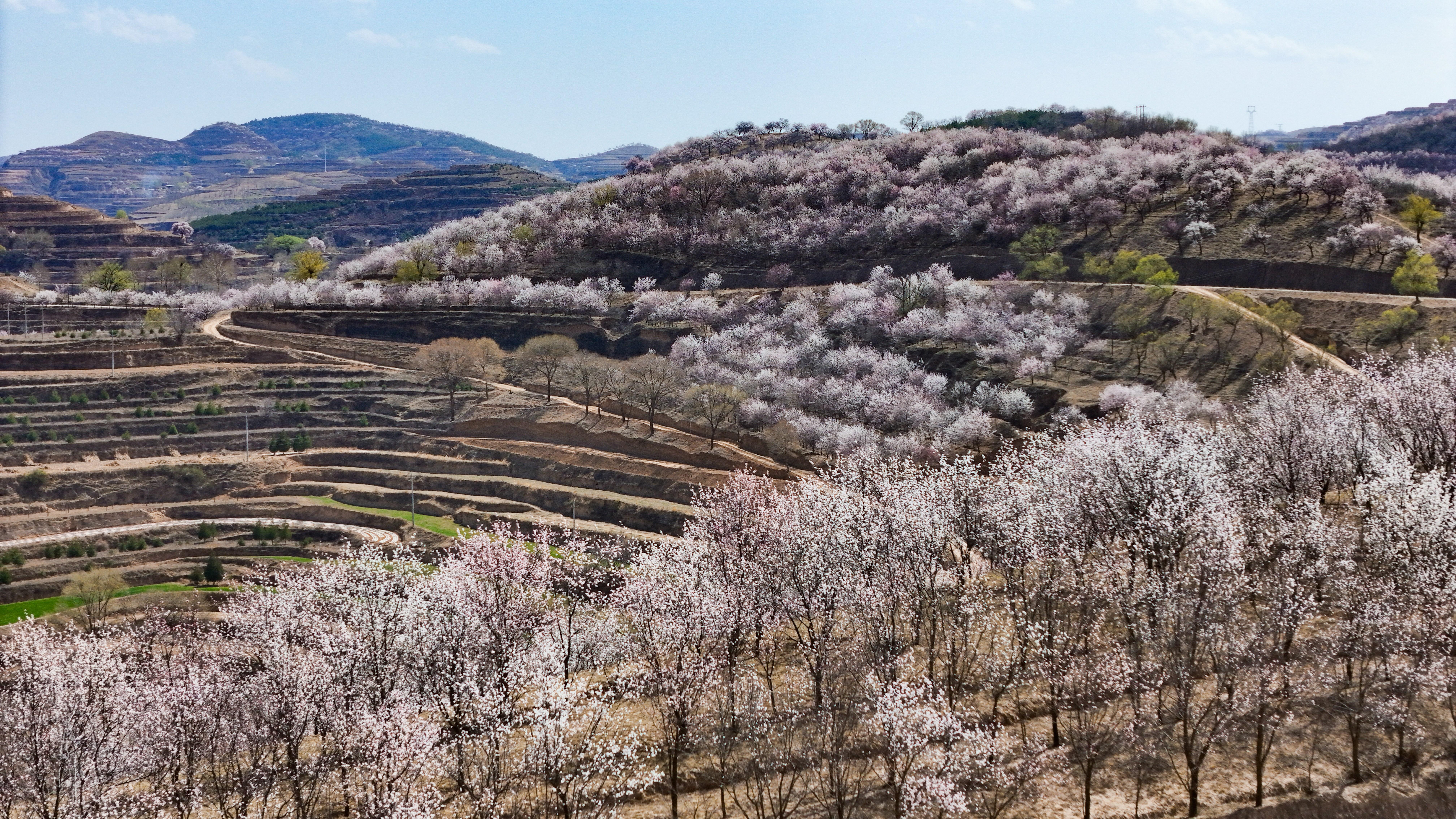 記者來到環(huán)縣天池鄉(xiāng),驅車沿山間公路緩緩前行數(shù)十公里,目光所及之處,溝壑梁峁間粉白連片盛放。平日里蒼茫厚重的黃土高原,滿是春日生機,漫步其間,仿若置身一幅靈動絕美的水墨丹青畫卷。