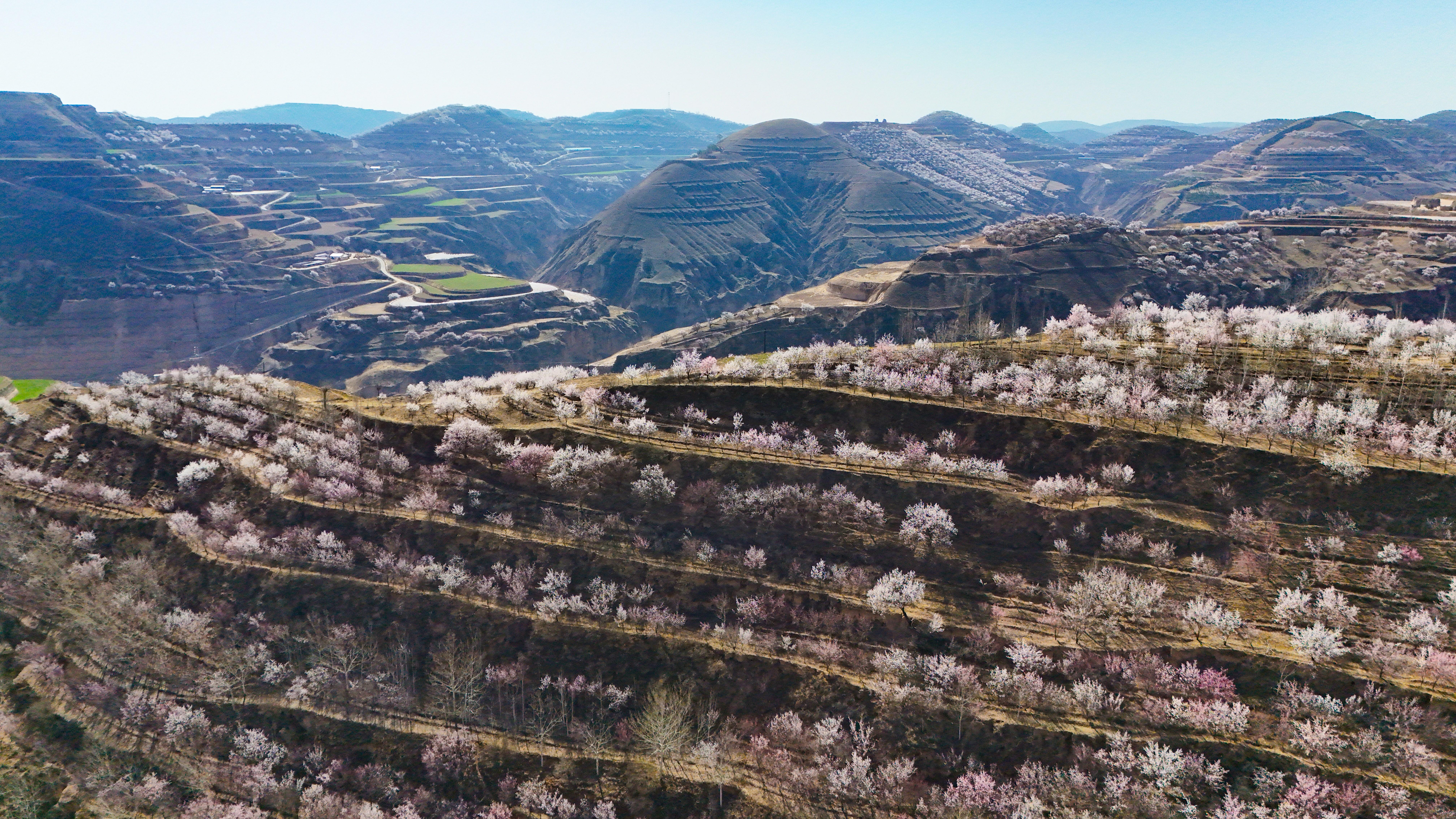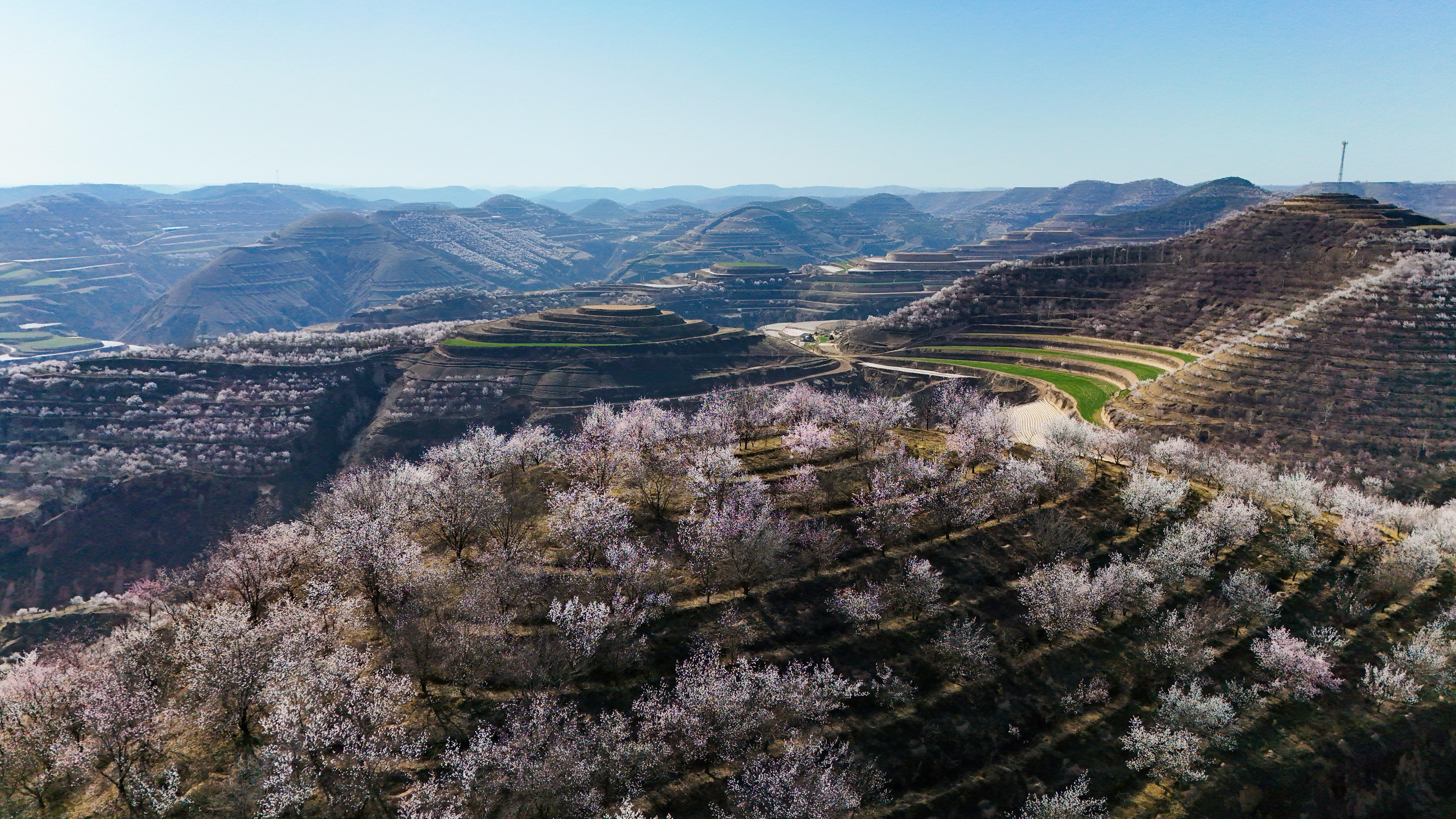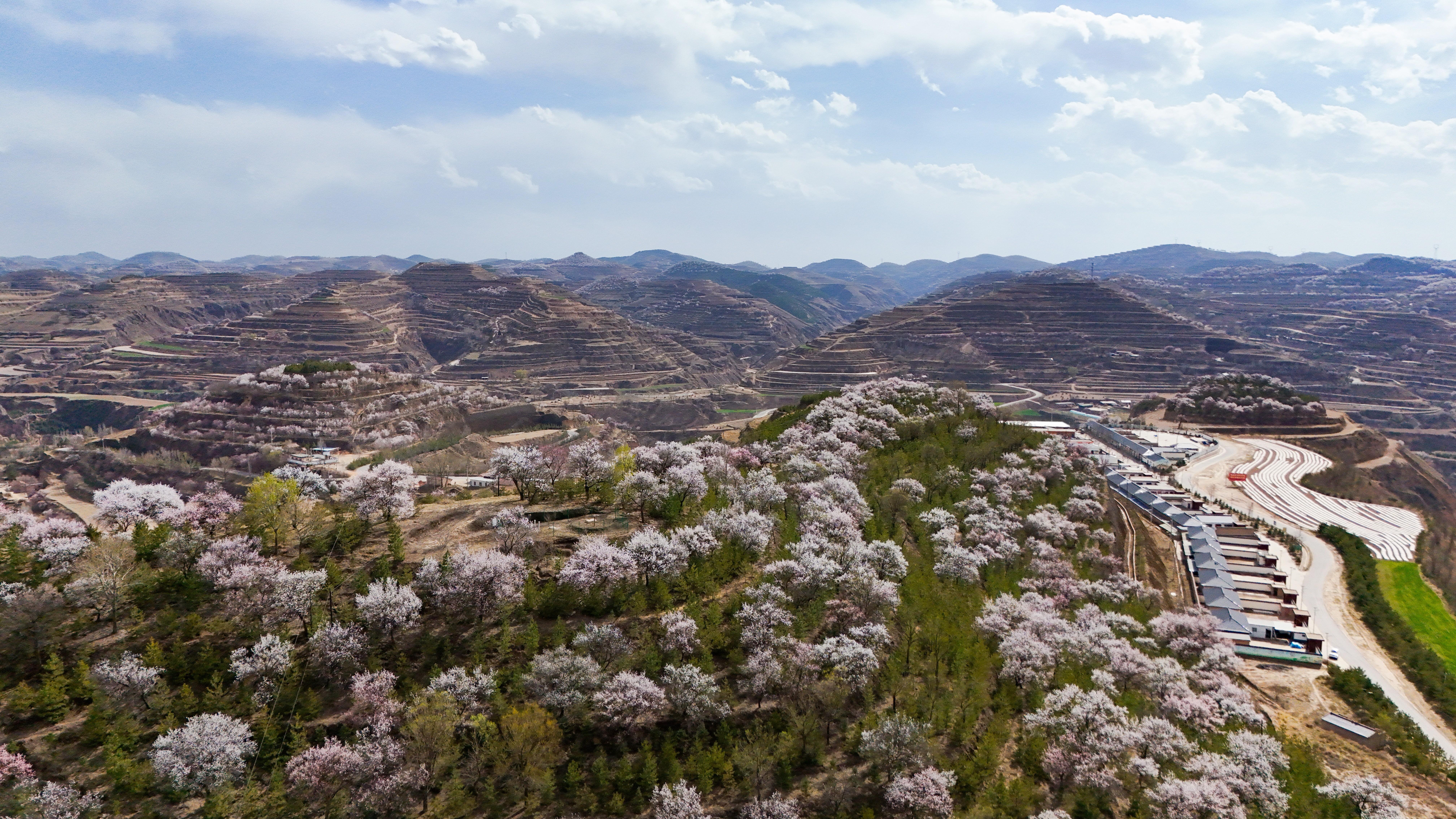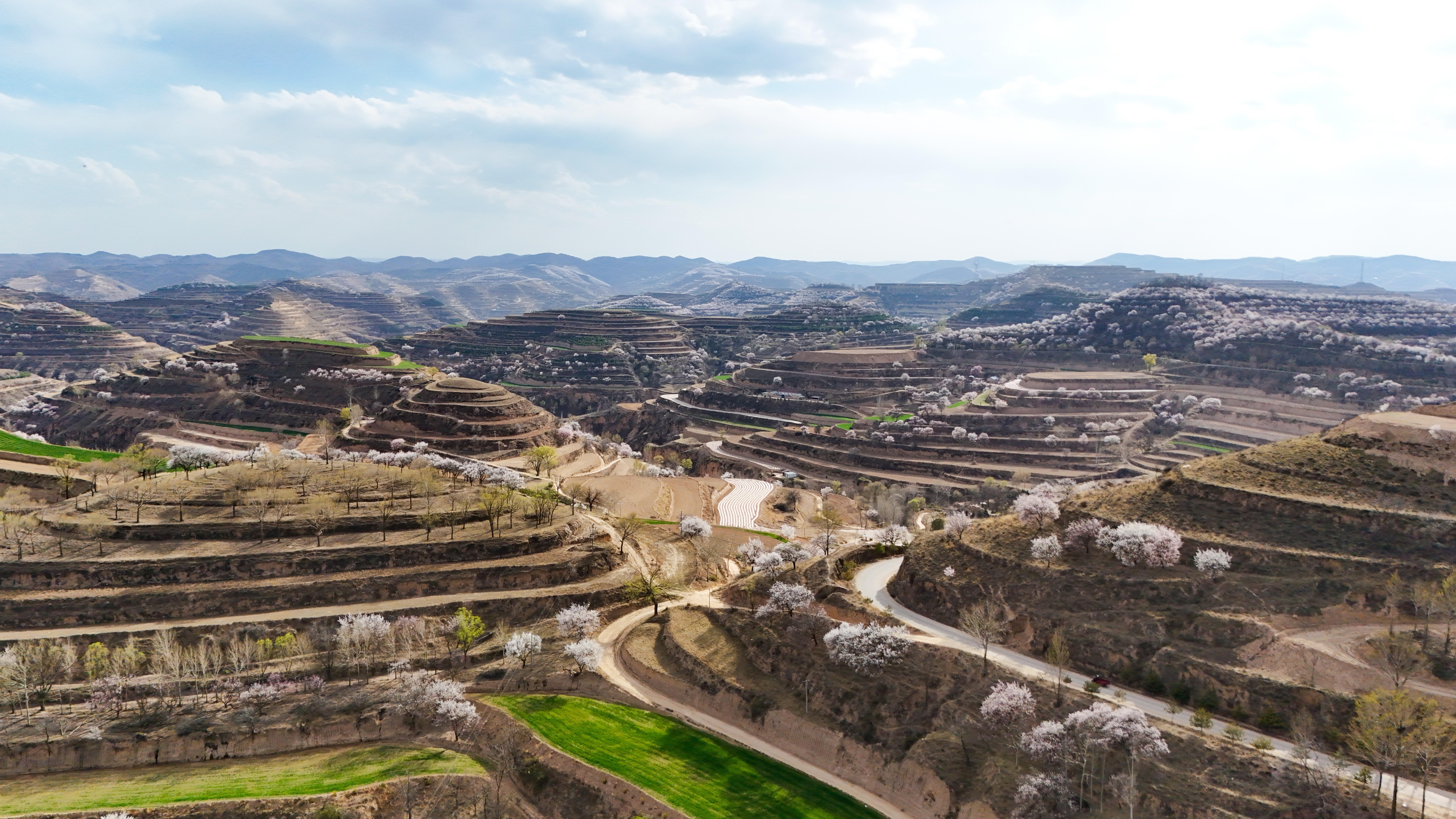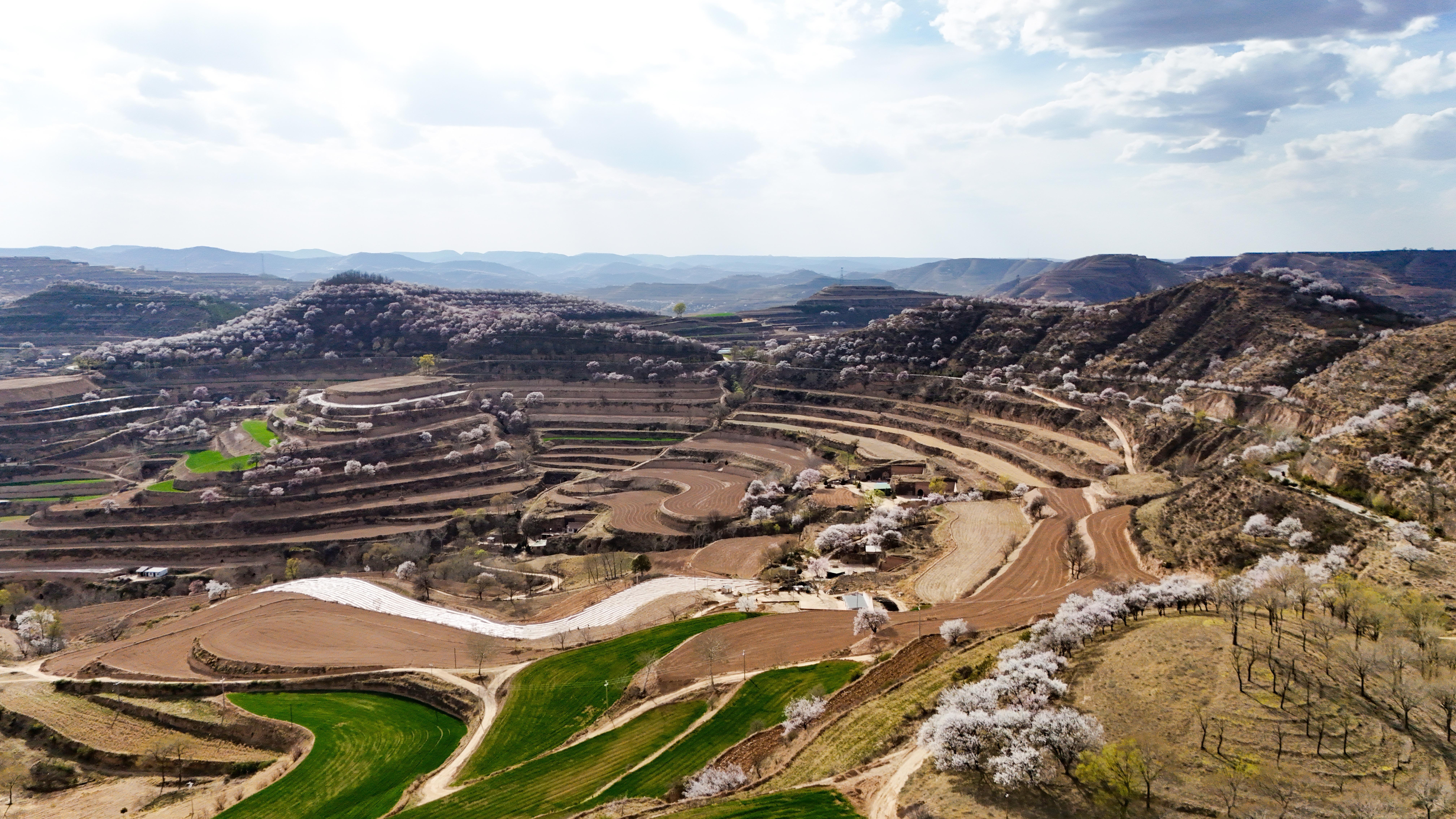 記者來到環(huán)縣天池鄉(xiāng),驅車沿山間公路緩緩前行數(shù)十公里,目光所及之處,溝壑梁峁間粉白連片盛放。平日里蒼茫厚重的黃土高原,滿是春日生機,漫步其間,仿若置身一幅靈動絕美的水墨丹青畫卷。