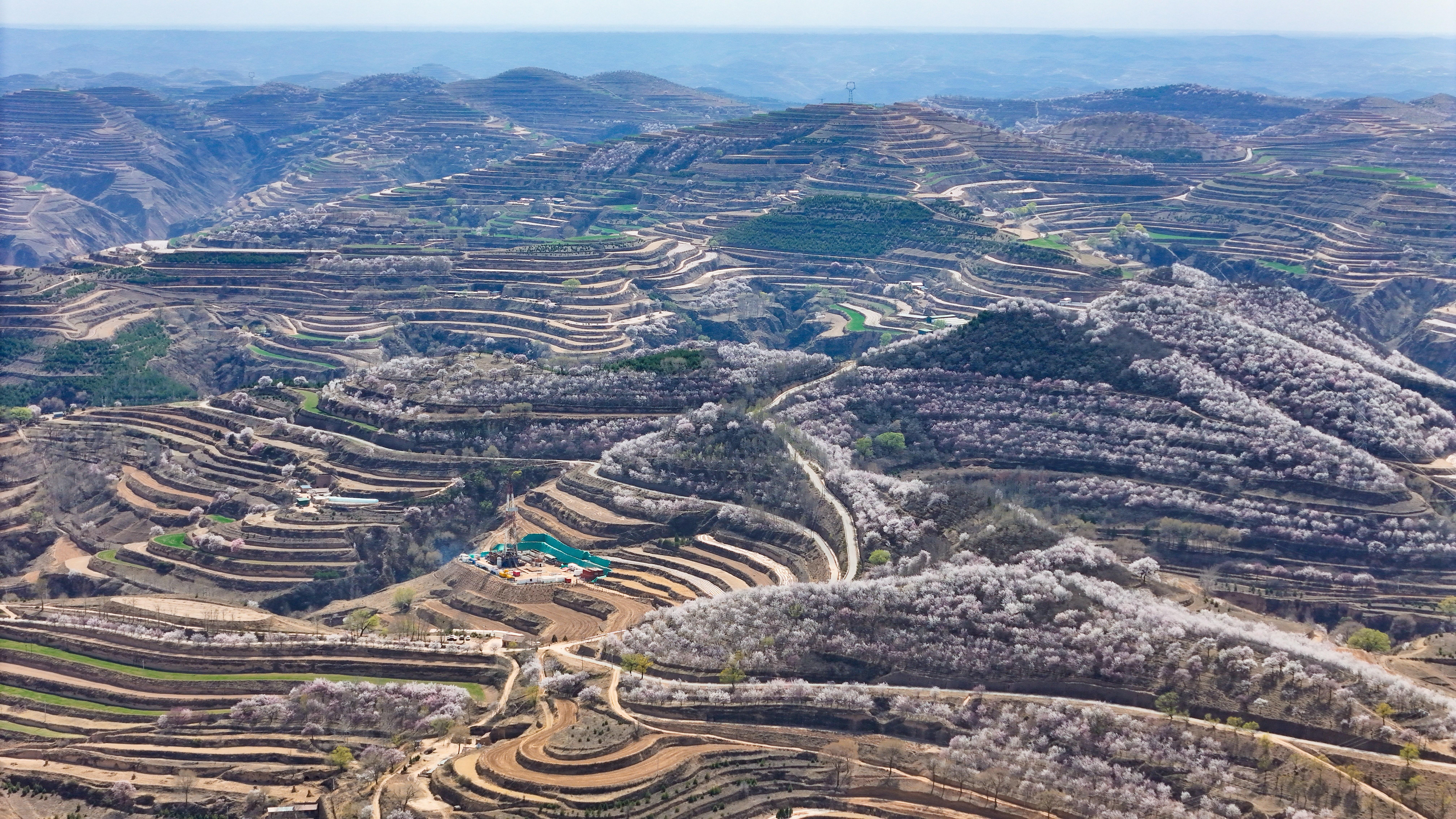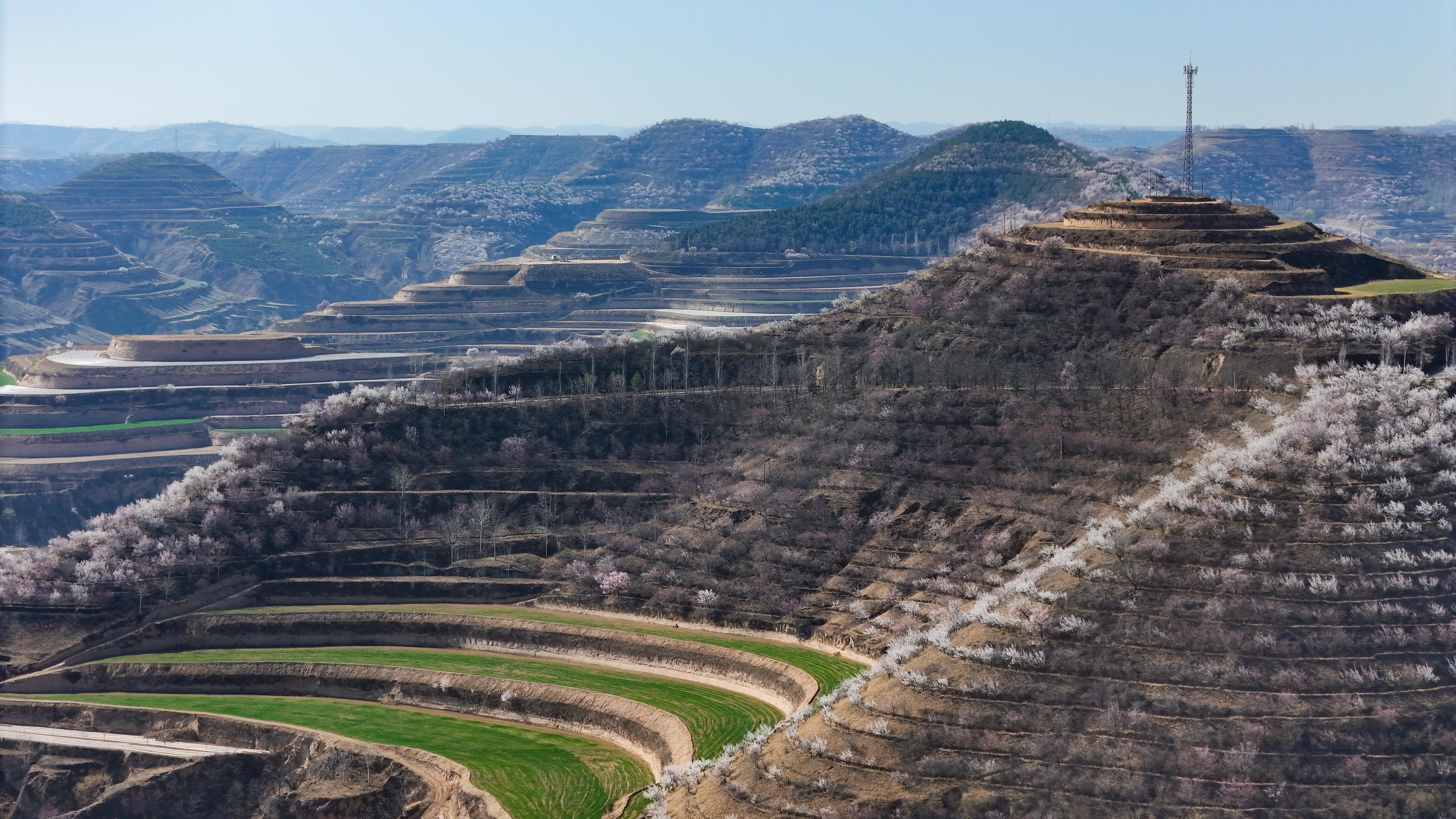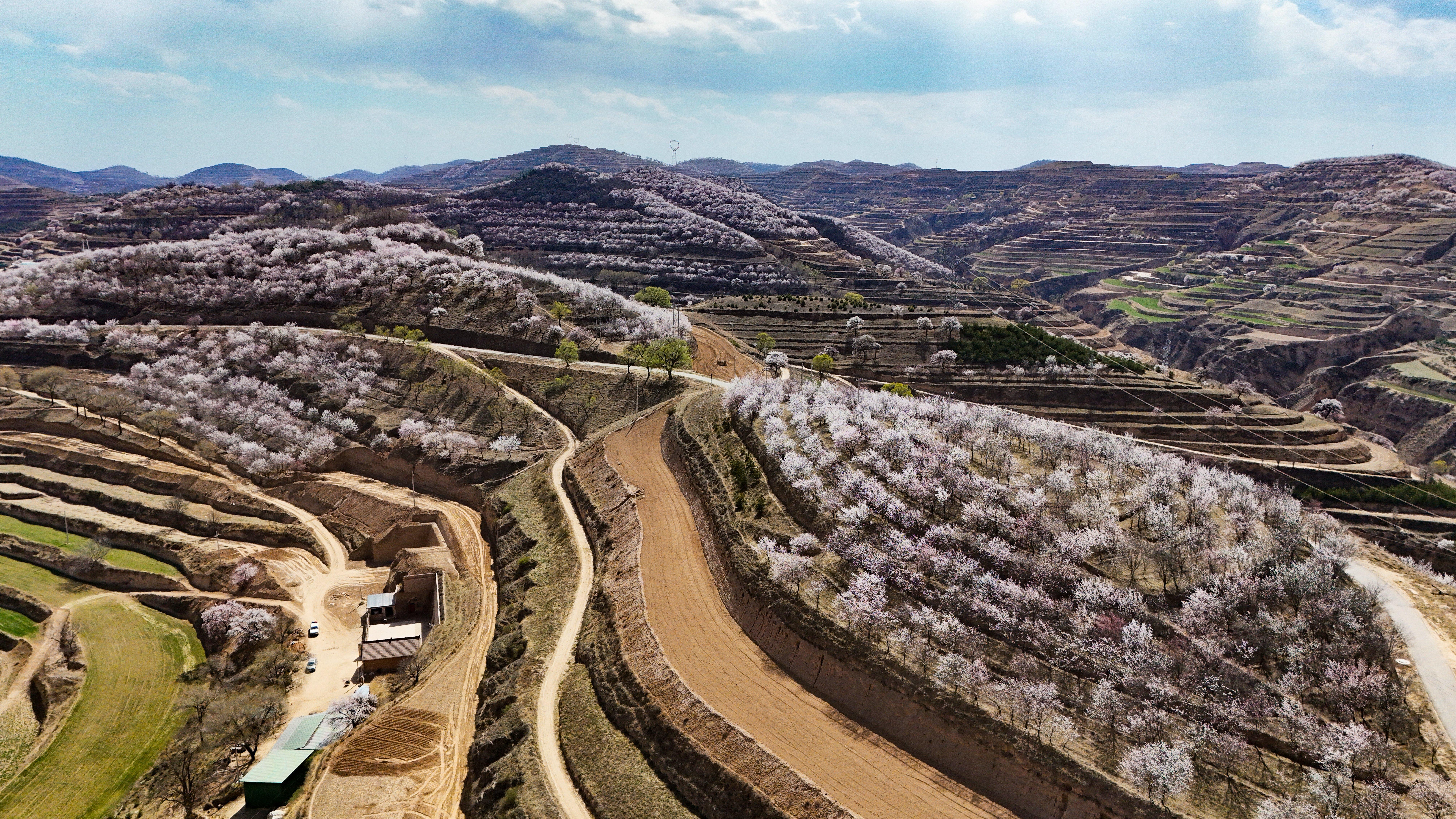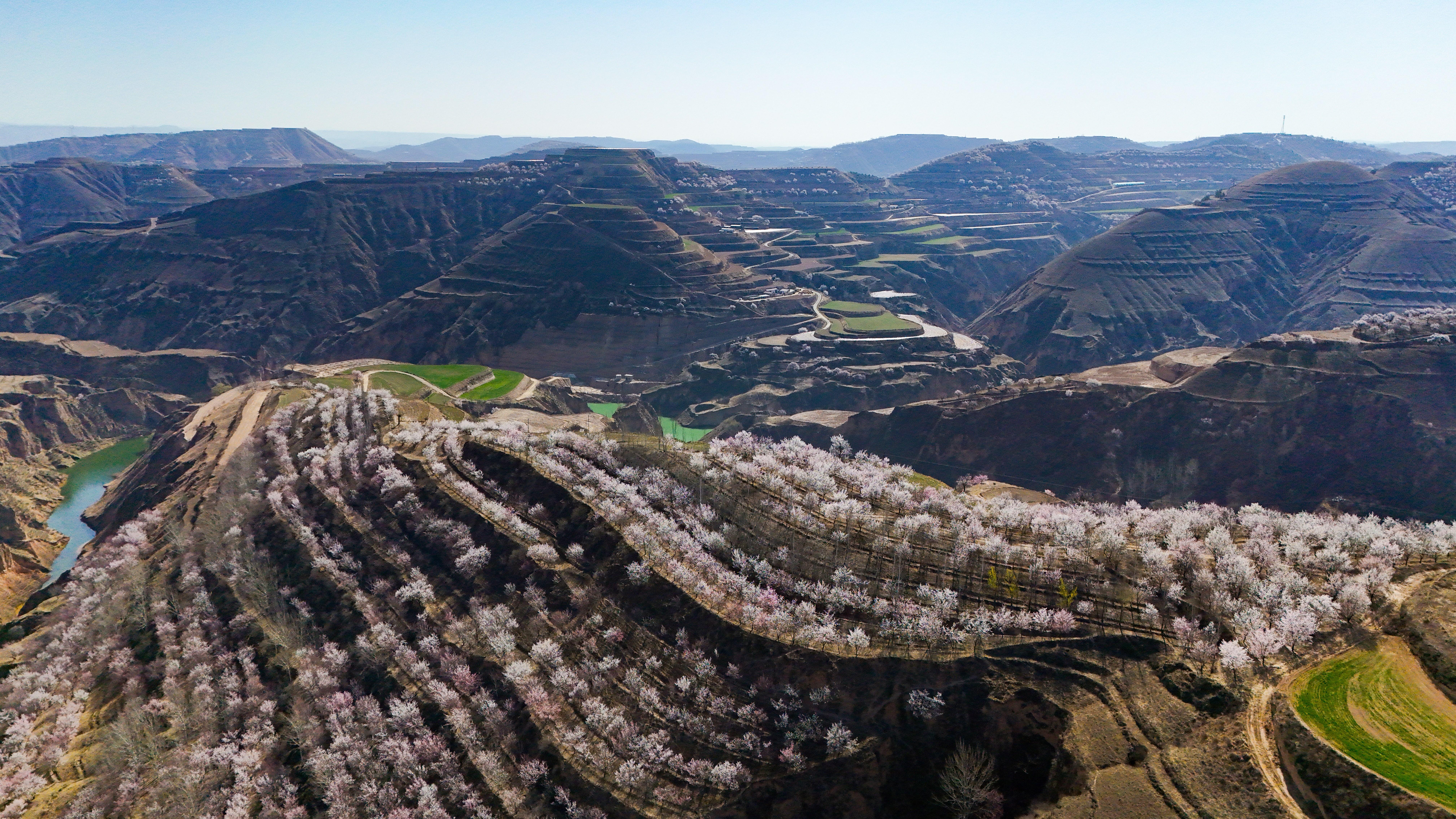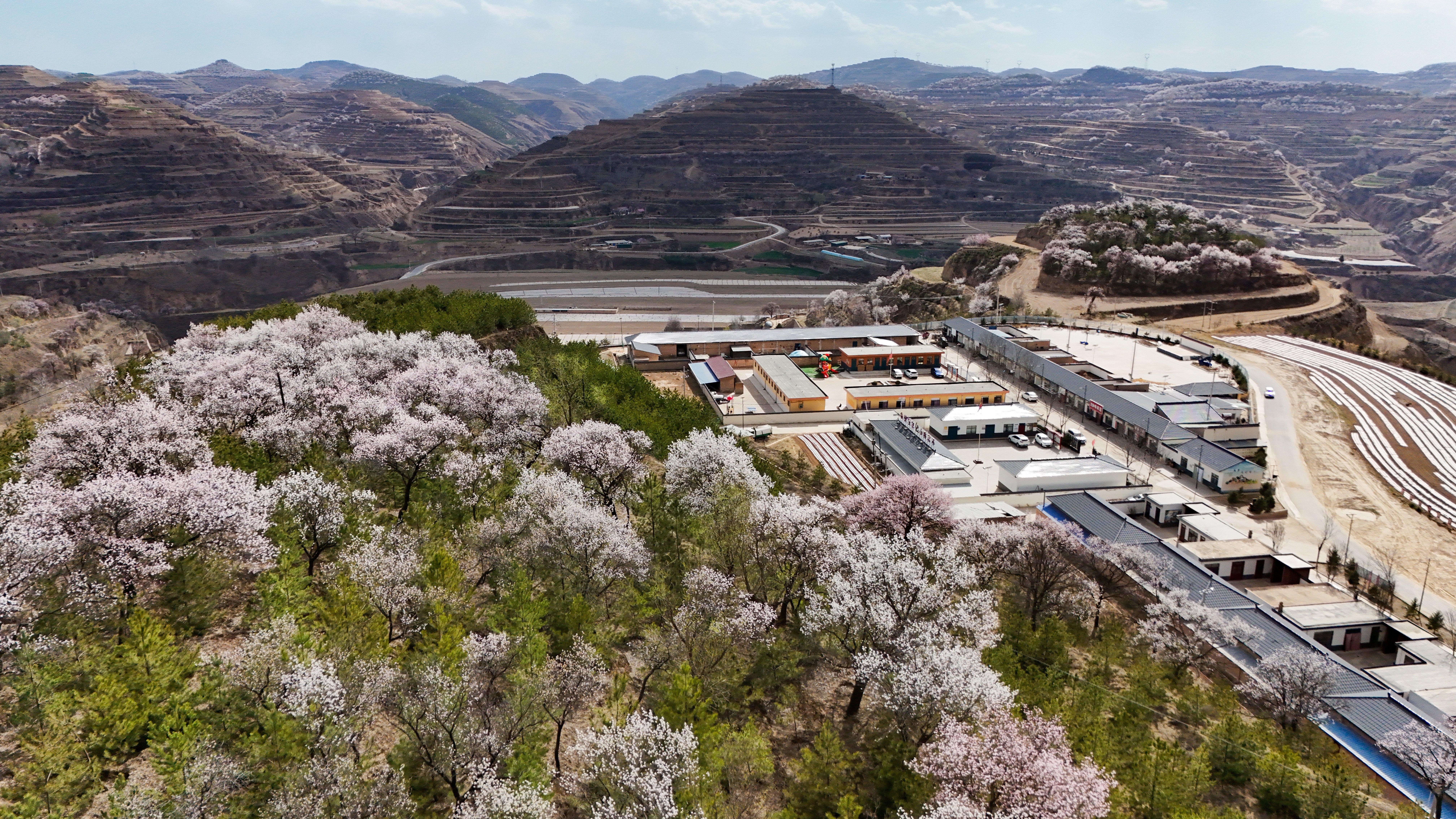 記者來到環(huán)縣天池鄉(xiāng),驅車沿山間公路緩緩前行數(shù)十公里,目光所及之處,溝壑梁峁間粉白連片盛放。平日里蒼茫厚重的黃土高原,滿是春日生機,漫步其間,仿若置身一幅靈動絕美的水墨丹青畫卷。