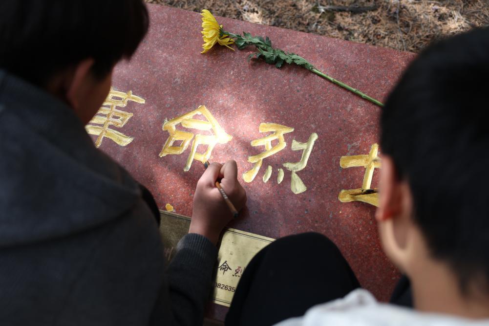 4月3日,參加祭掃活動(dòng)的學(xué)生在蘭州市烈士陵園為無(wú)名烈士墓碑描金。新華社記者 陳斌 攝