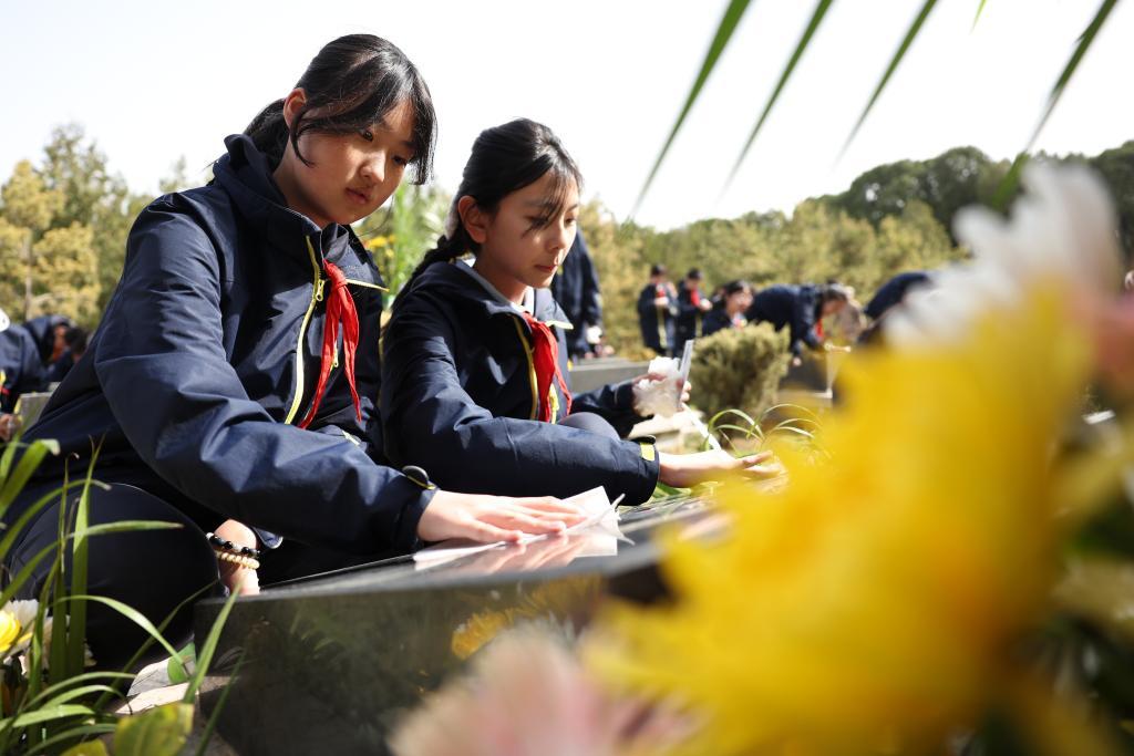 4月3日,參加祭掃活動(dòng)的學(xué)生在蘭州市烈士陵園擦拭烈士墓碑。新華社記者 陳斌 攝