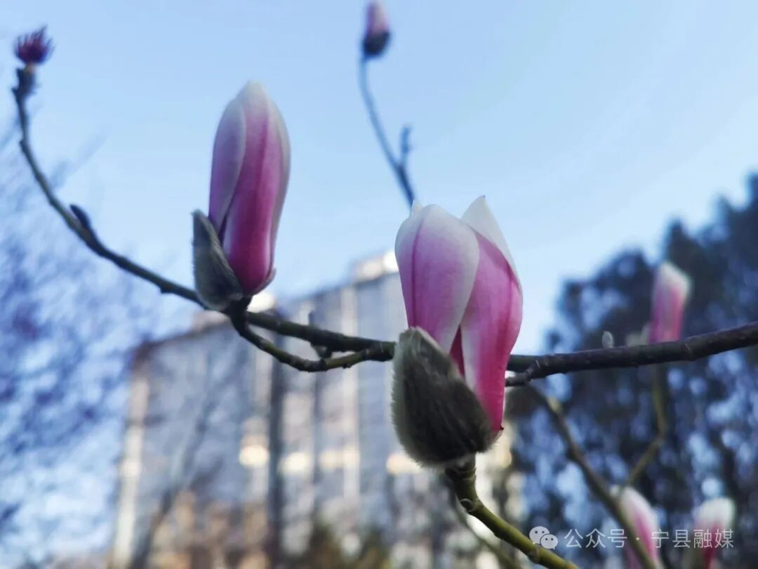 玉蘭花亭亭玉立,素白瑩潤(rùn),或凝脂堆雪,或淡粉含羞,不葉而花,高潔清雅,宛若云端仙子,靜立枝頭。