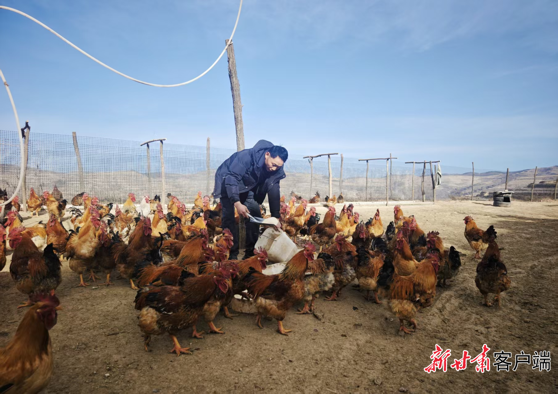 李余強(qiáng)正在給雞喂食。新甘肅·甘肅日?qǐng)?bào)記者 田麗媛攝