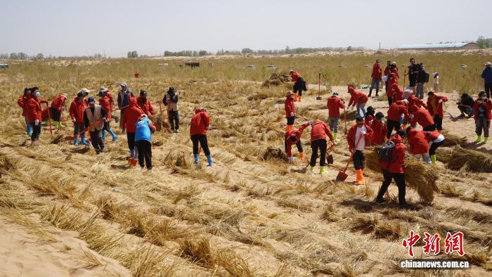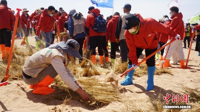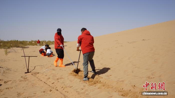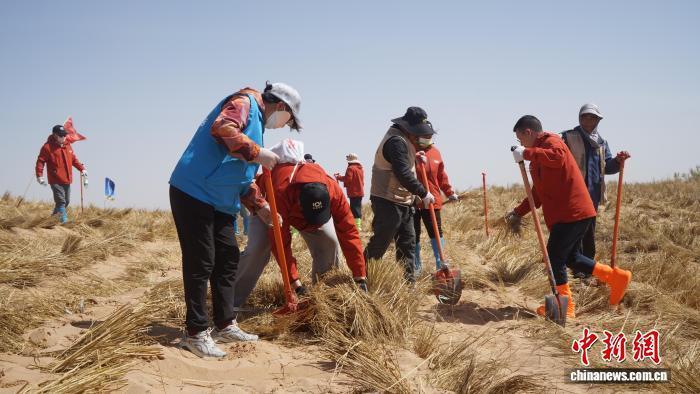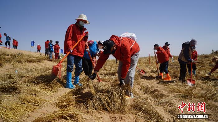 圖為民眾協(xié)作揮锨“種植”草方格沙障固沙壓沙。陳媛 攝