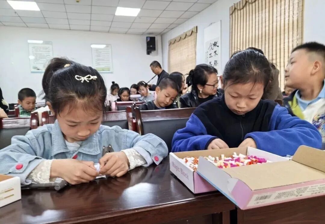 活動現(xiàn)場,溫馨的閱讀氛圍滿滿。在親子共讀環(huán)節(jié),家長與孩子并肩而坐,共同翻閱繪本、誦讀經(jīng)典、分享故事,從紅色經(jīng)典、傳統(tǒng)文化故事到趣味兒童讀物,在輕聲共讀中交流感悟、傳遞溫暖,一幕幕溫馨有愛的閱讀場景,讓書香融入家庭日常。在益智積木手工搭建環(huán)節(jié),孩子們在家長的陪伴與協(xié)作下,充分發(fā)揮想象力與創(chuàng)造力,用一塊塊積木搭建出心中的閱讀小屋、童話世界、夢想家園等創(chuàng)意作品,將閱讀感悟與手工創(chuàng)作深度融合?;顒蝇F(xiàn)場還設(shè)置了作品展示,進(jìn)一步激發(fā)孩子們的參與熱情與創(chuàng)作興趣,讓孩子們在動手實踐中鍛煉思維、收獲快樂。
