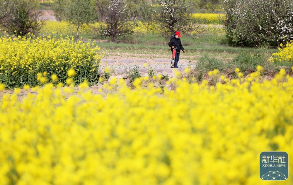 ↑ 4月24日,村民在甘肅省天水市武山縣境內(nèi)的油菜花田旁勞作。