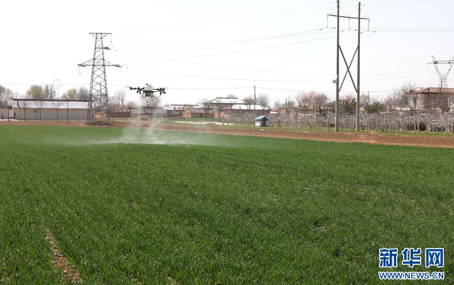 慶陽市西峰區(qū)董志鎮(zhèn)郭堡村無人機飛防作業(yè)現(xiàn)場。(盤小美 攝)